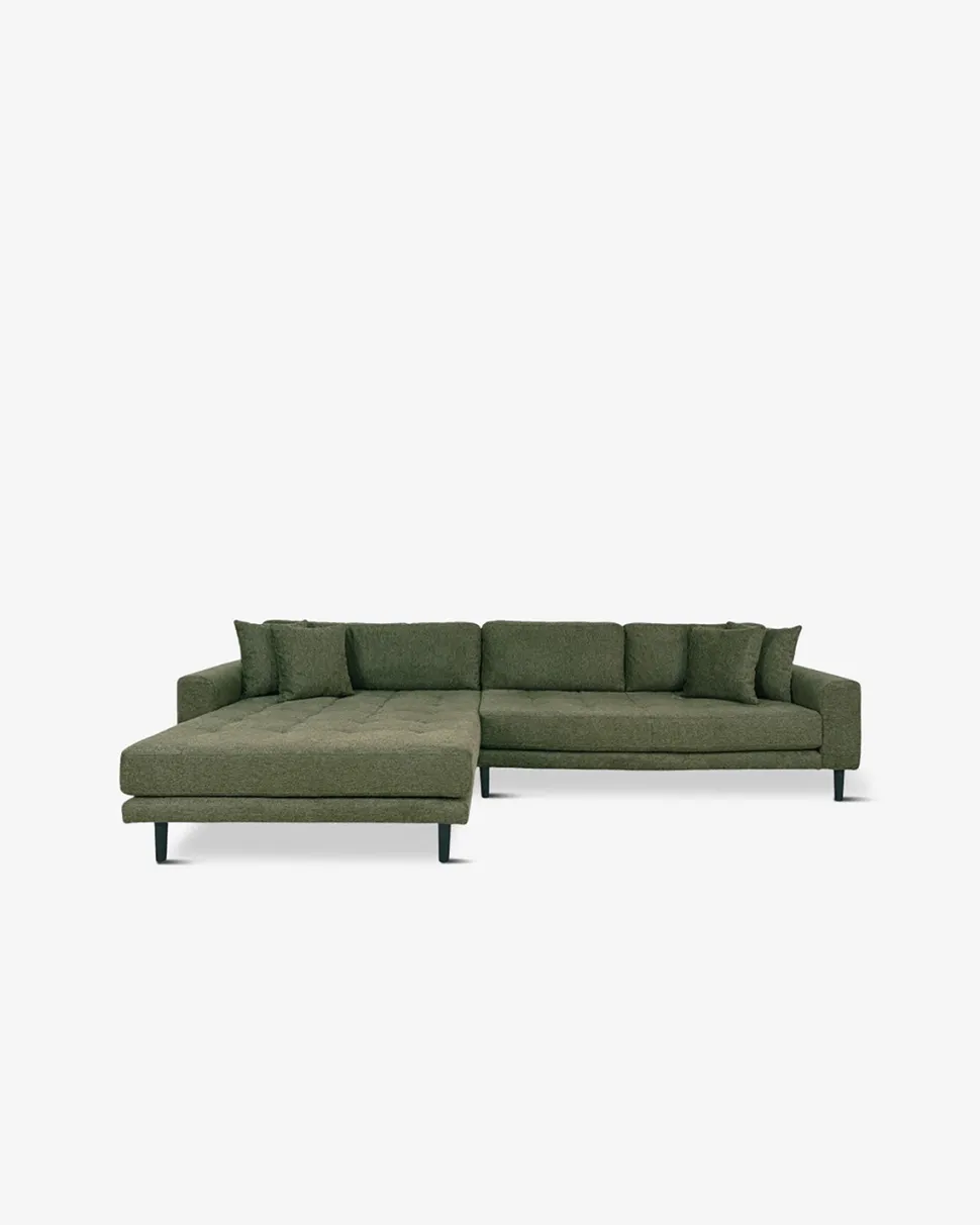 Sofaen har en dejlig stor, bred chaiselong, så man nemt kan sidde 2 sammen og flette fingre. Hynderne er fyldt med skum, der giver en lækker komfort og lokker til at blive flydende. Der medfølger fire pyntepuder.