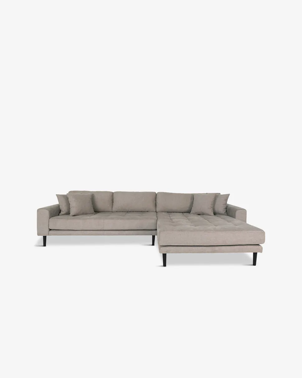 Sofaen har en dejlig stor, bred chaiselong, så man nemt kan sidde 2 sammen og flette fingre. Hynderne er fyldt med skum, der giver en lækker komfort og lokker til at blive flydende. Der medfølger fire pyntepuder.