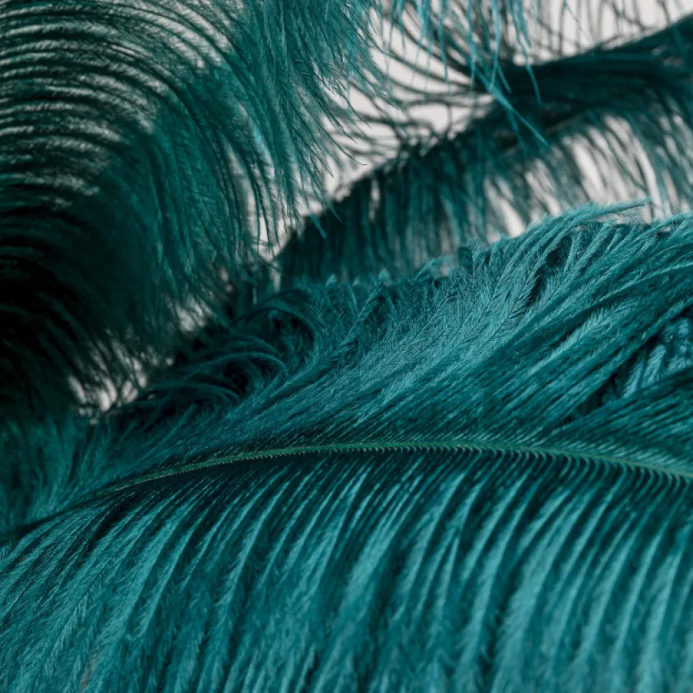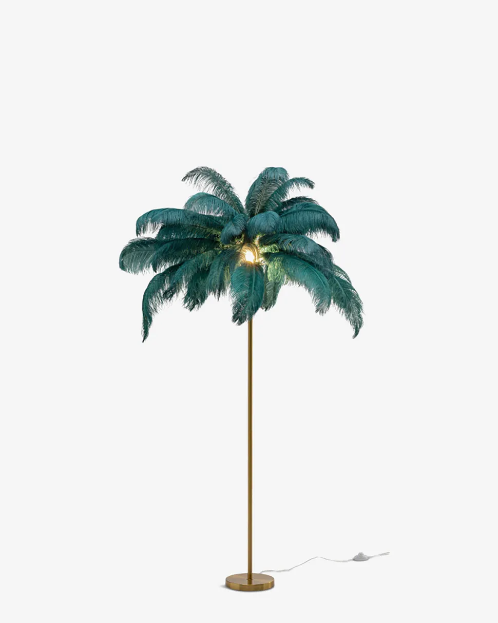 Denne Unikke og iøjnefaldende gulvlampe vil skabe stort bilkfang i din stue med sine flotte, petrolfarvede fjer og stellet, som er messingfarvet stål.