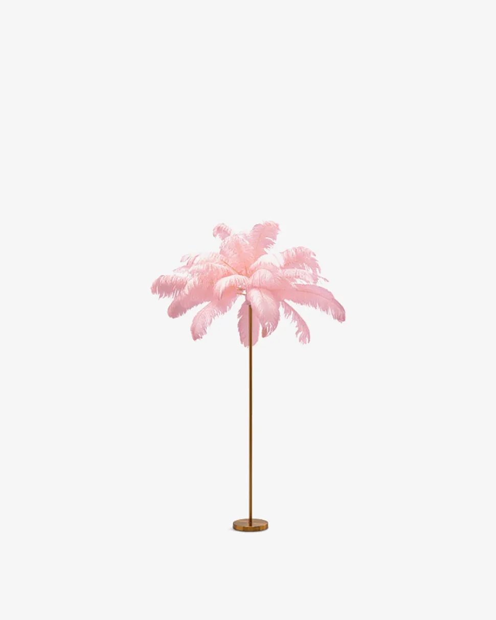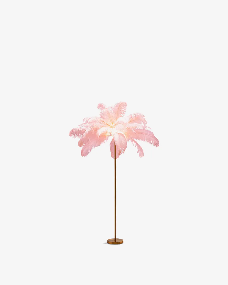 Denne unikke og iøjnefaldende gulvlampe vil skabe stort blikfang i din stue med sine flotte, pink fjer og stellet, som er messingfarvet stål.