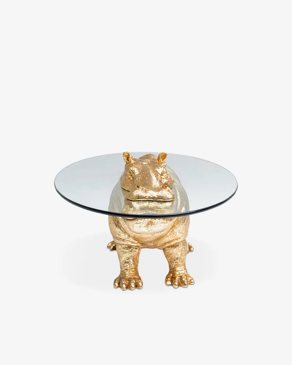 Hippo sidebordet med en dyrefigur – Flodhest figuren fortsætter gennem bordpladen af sikkerhedsglas, som får det til at se ud som om, at flodhesten lige er ved at komme op af vandet. Rundt om flodhesten giver glasbordet plads til at placere drinks og snacks. Den søde flodhest gør dette stuebord lavet af glas til et rigtigt blikfang.