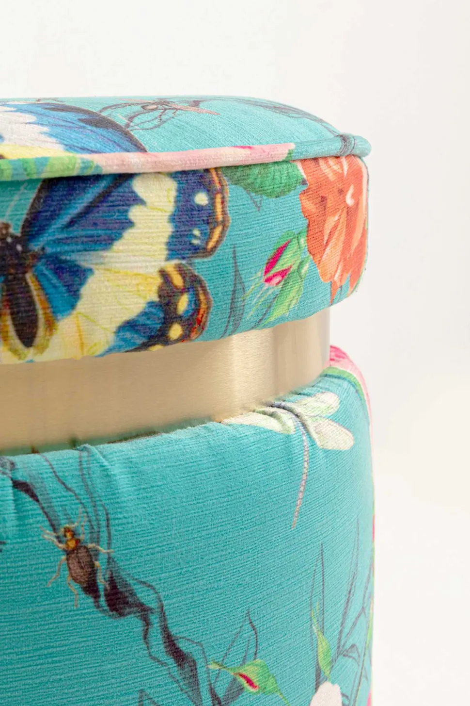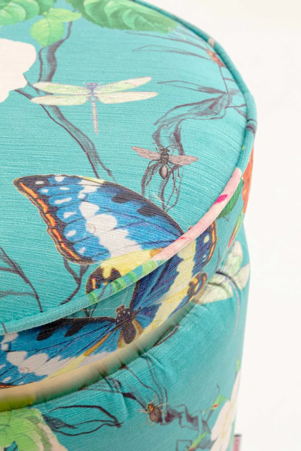 Elegant og farverig puf med botanisk mønster. Denne runde puf er betrukket med stof i en frisk turkis nuance, dekoreret med smukke blomster, grønne blade og farverige sommerfugle.