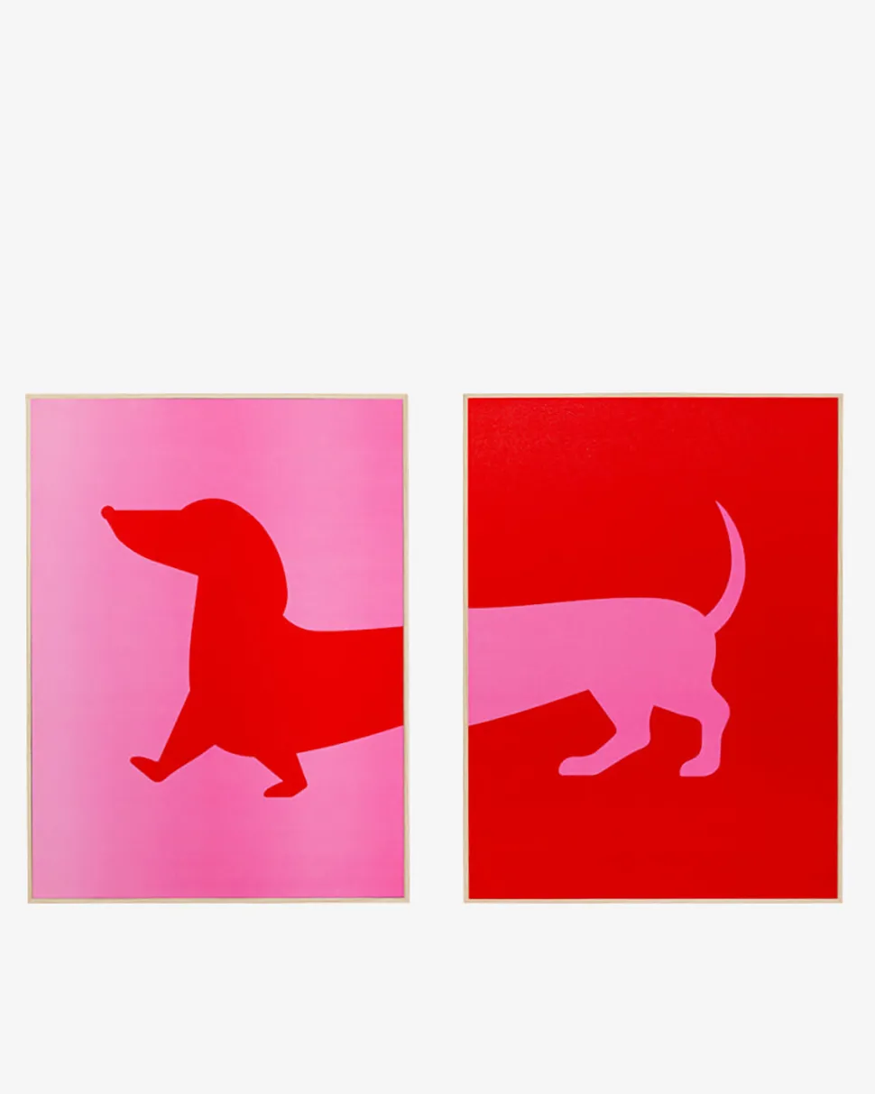 Sødt og Sjovt 2-delt Canvas Billede med en charmerende lille hund, præsenteret i røde og lyserøde nuancer.