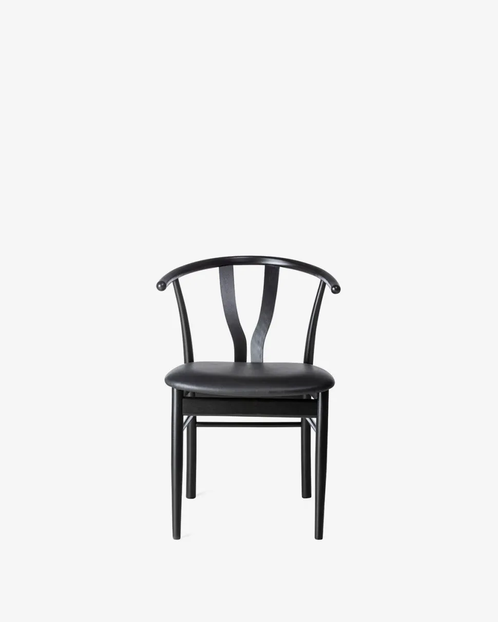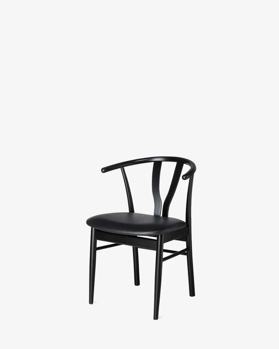 Freja spisebordsstol – rund ryg med armlæn og komfortabelt sæde. Sort træstel og polstret sort lædersæde i et indbydende og tidløst design.