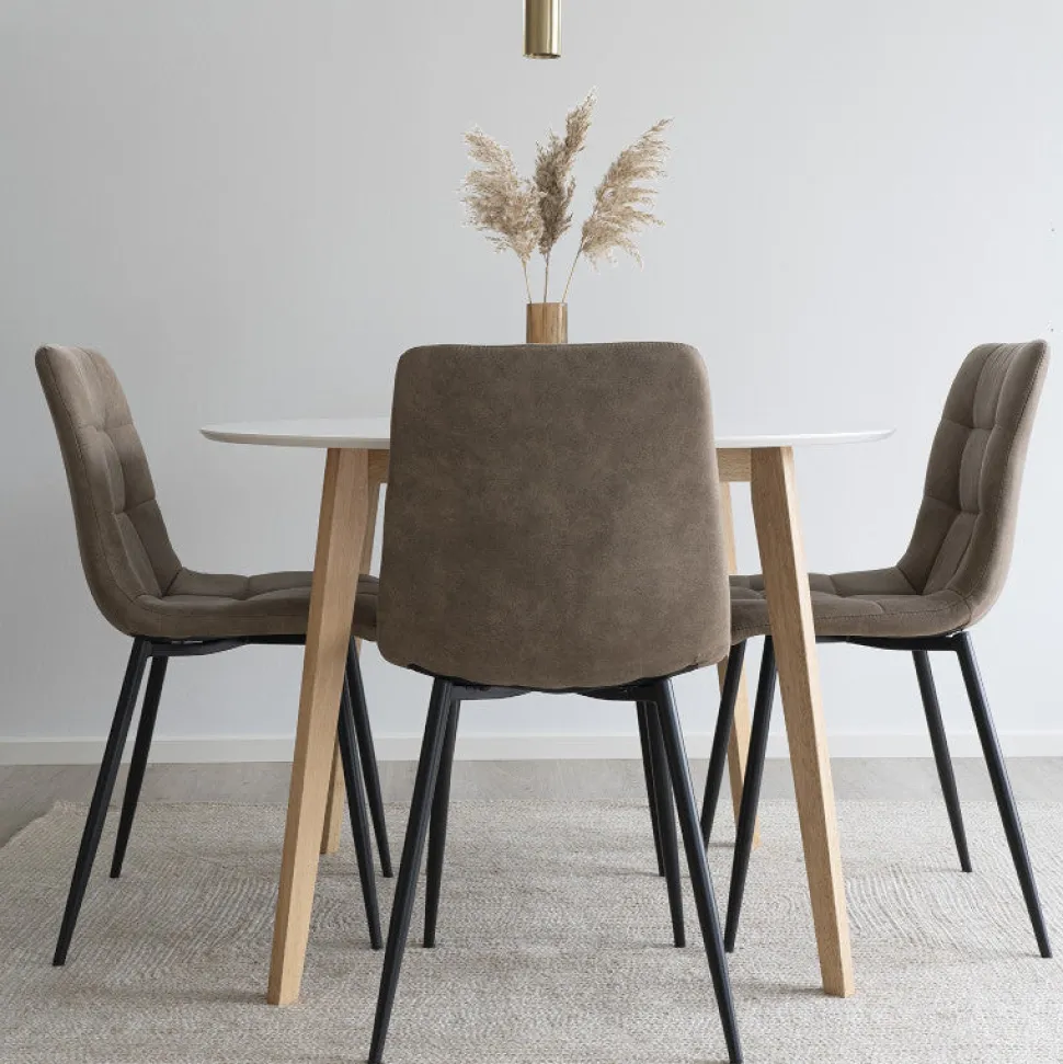 Frigg Spisebordsstol er her i en lækker lys brun mikrofiber. Den er både komfortabel og indbydende.