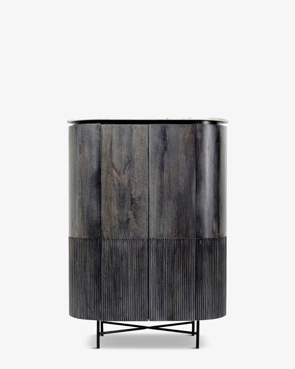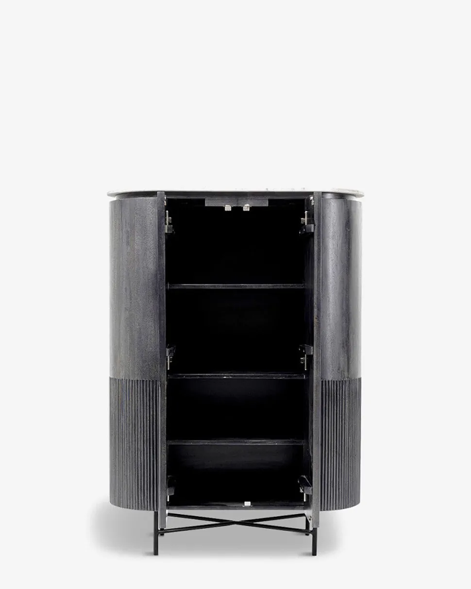 Det høje, flotte Glenn vitrineskab er et meget dekorativt møbel i sort mangotræ og med hvide marmor-detaljer.