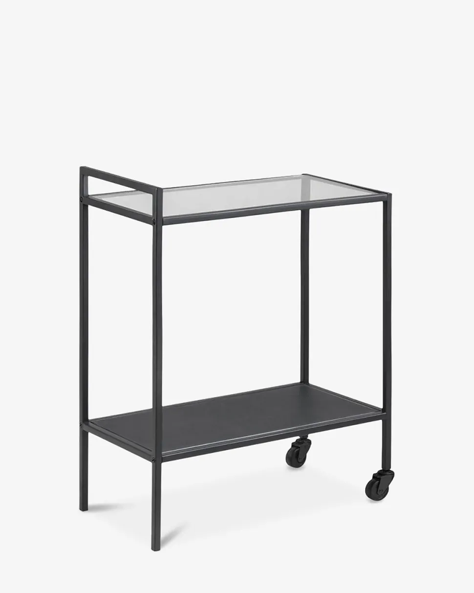 Fint rullebord på hjul som kan gøre det ud som det perfekte barbord. Bordet er udført i sort lakeret metal, med glas hylde.
