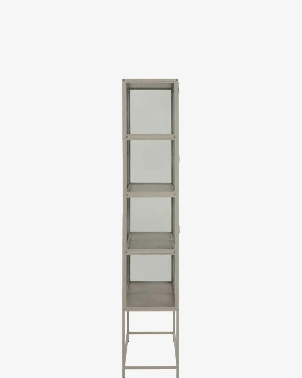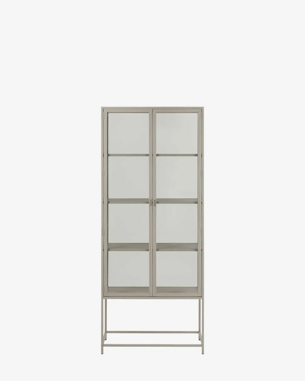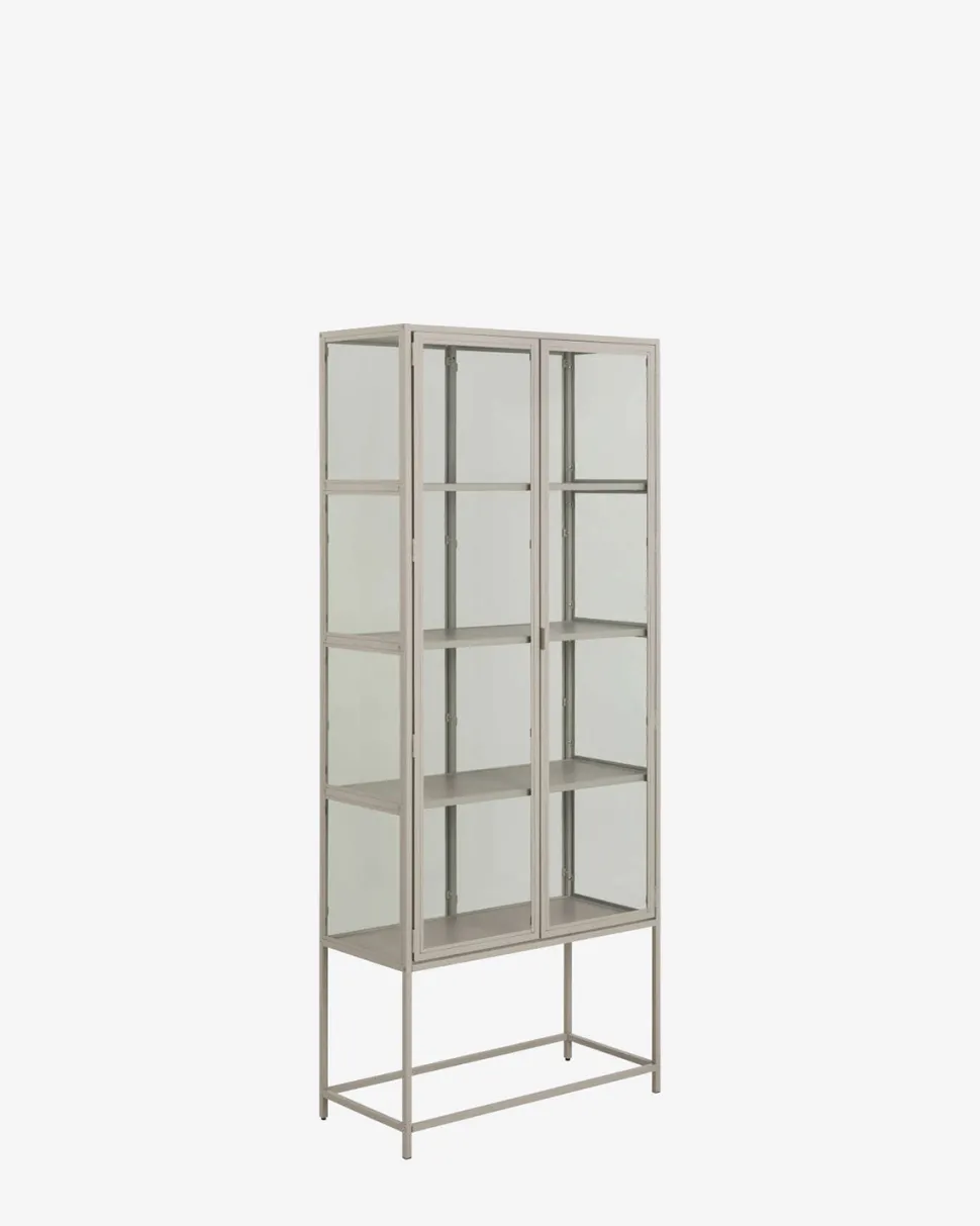 Gwenn vitrineskabet kombinerer funktionel opbevaring med et let og stilrent design. Skabet er udført i grålakeret metal med glaslåger og glaspaneler i siderne, som giver et åbent og luftigt udtryk – perfekt til at fremhæve dine yndlingsgenstande, porcelæn eller bøger.