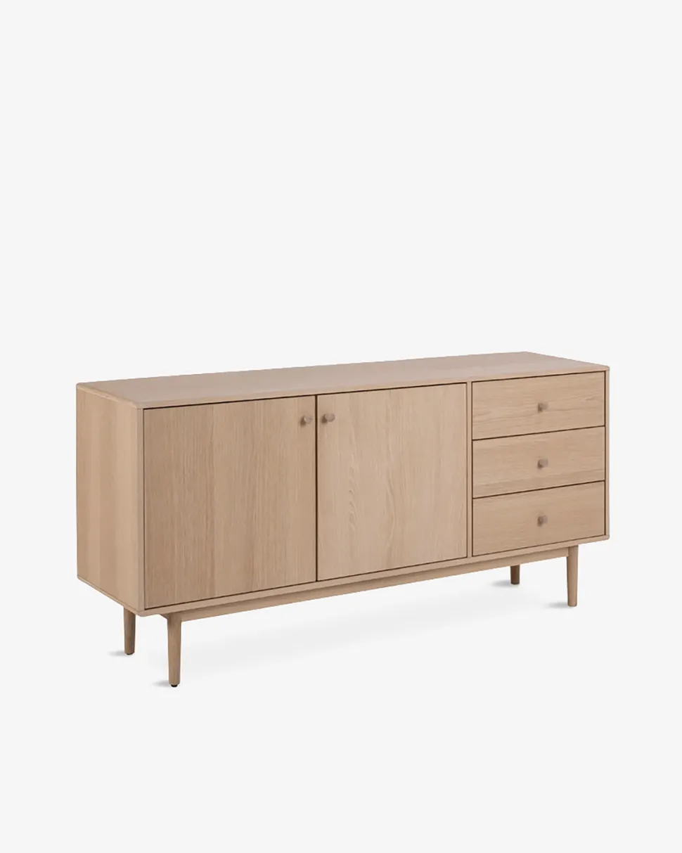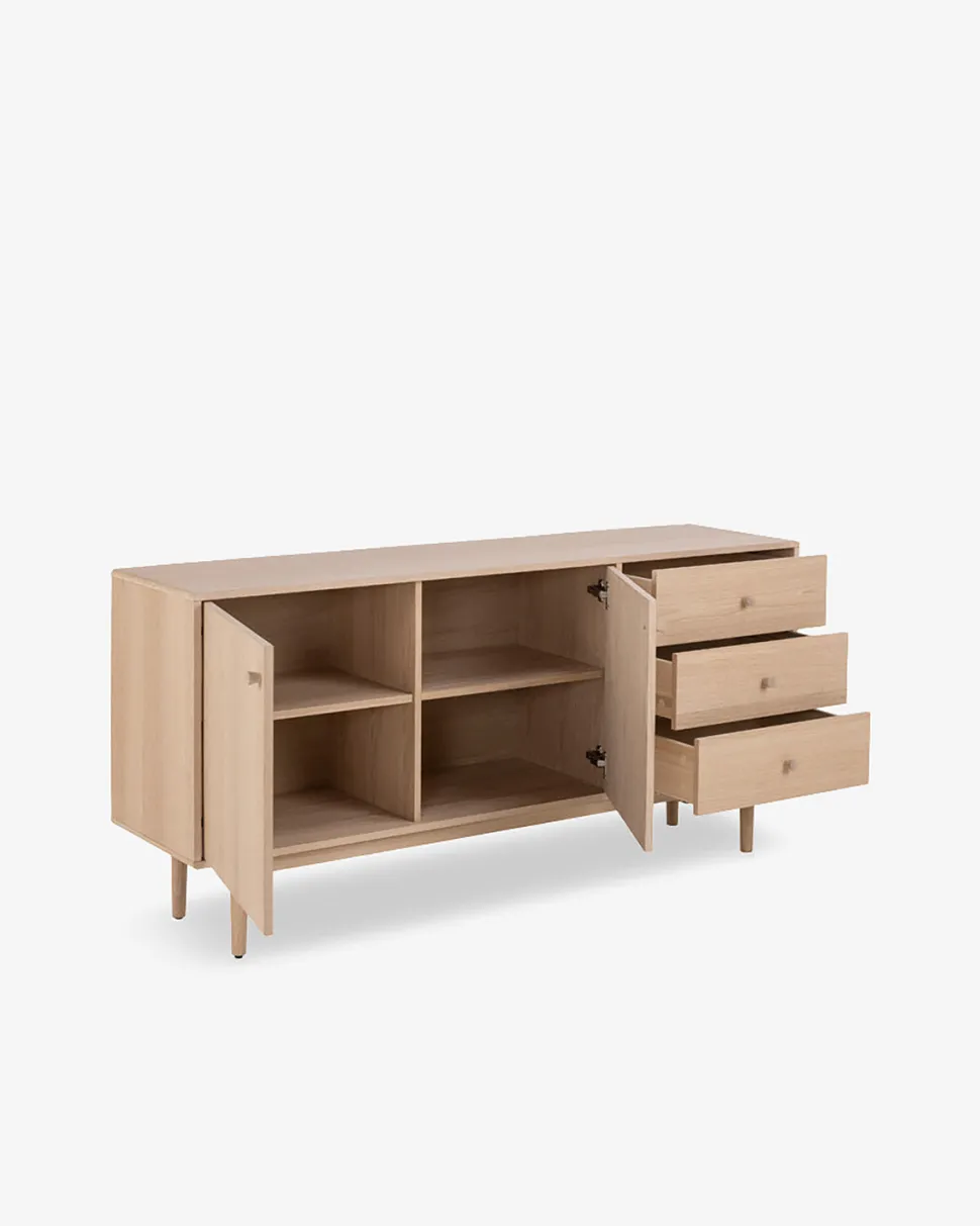 Skænken har to låger med hylder samt tre store skuffer med god plads til opbevaring.