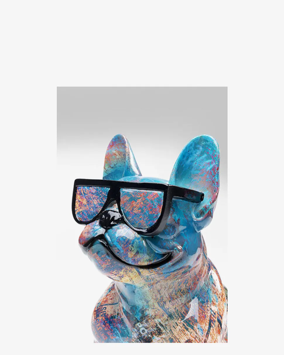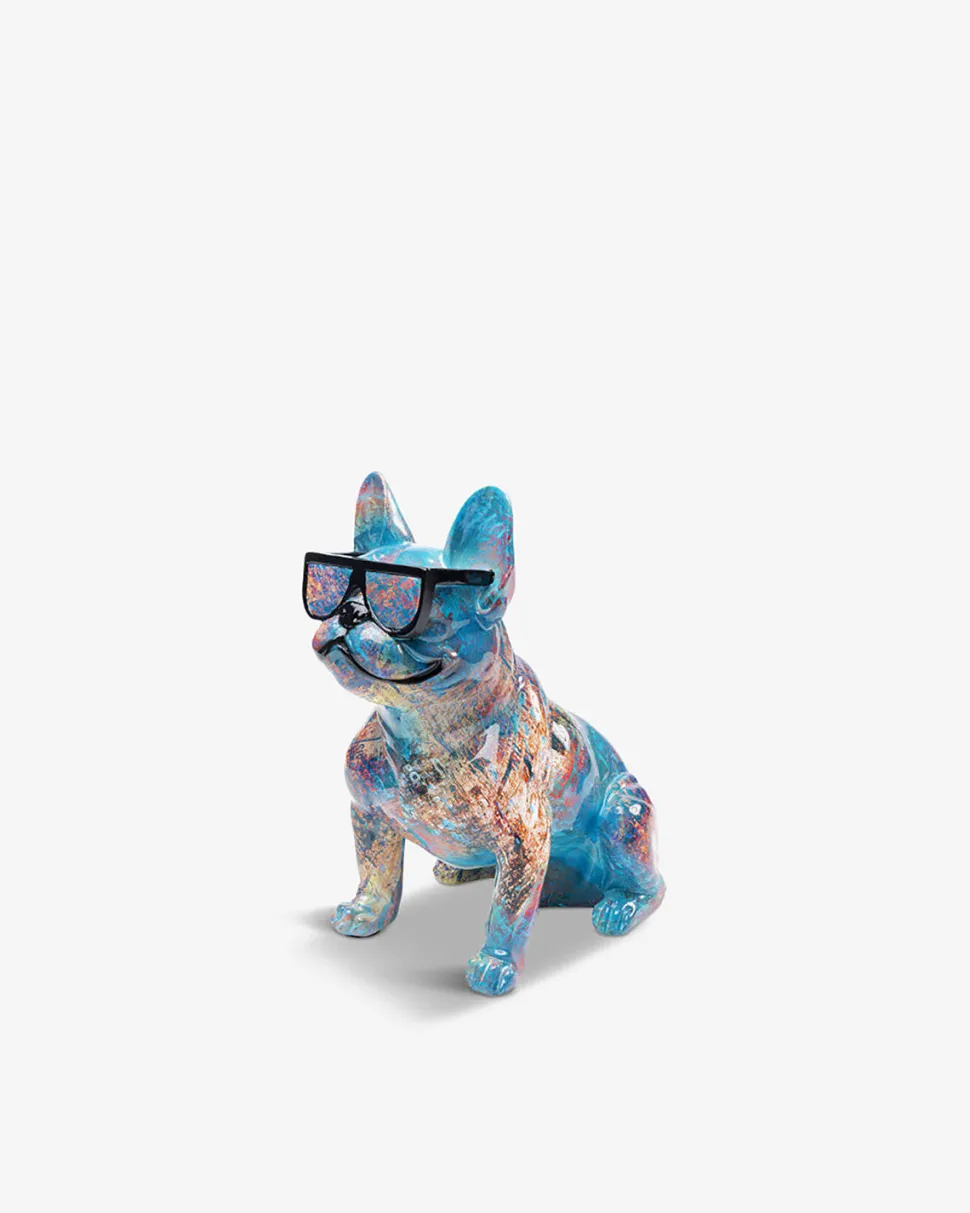 Siddende hundefigur med farverigt maling, som gør en dekorativ skulptur til et fedt lille kunstværk.