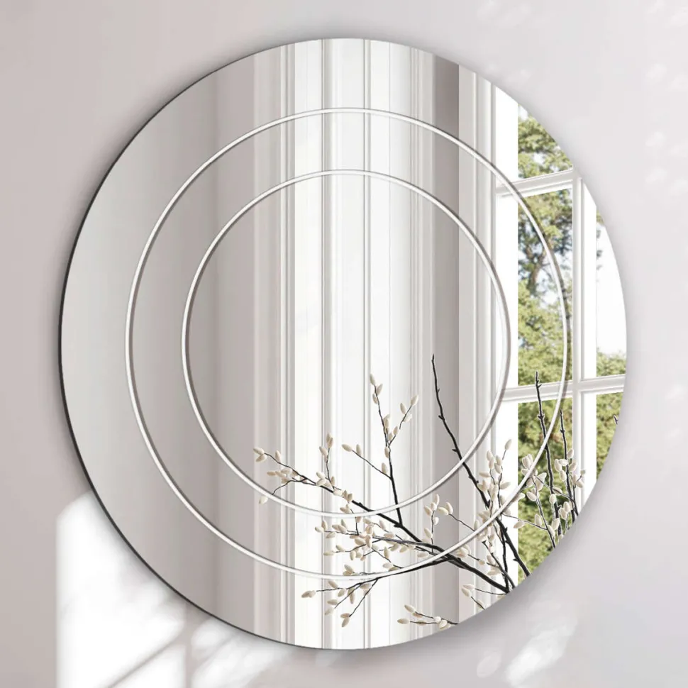 In the Circle spejlet kombinerer funktion med grafisk finesse. De indlagte cirkler i glasset er facetslebne og skaber et smukt spil, når lyset rammer overfladen. Et dekorativt element, der giver spejlet dybde og karakter.