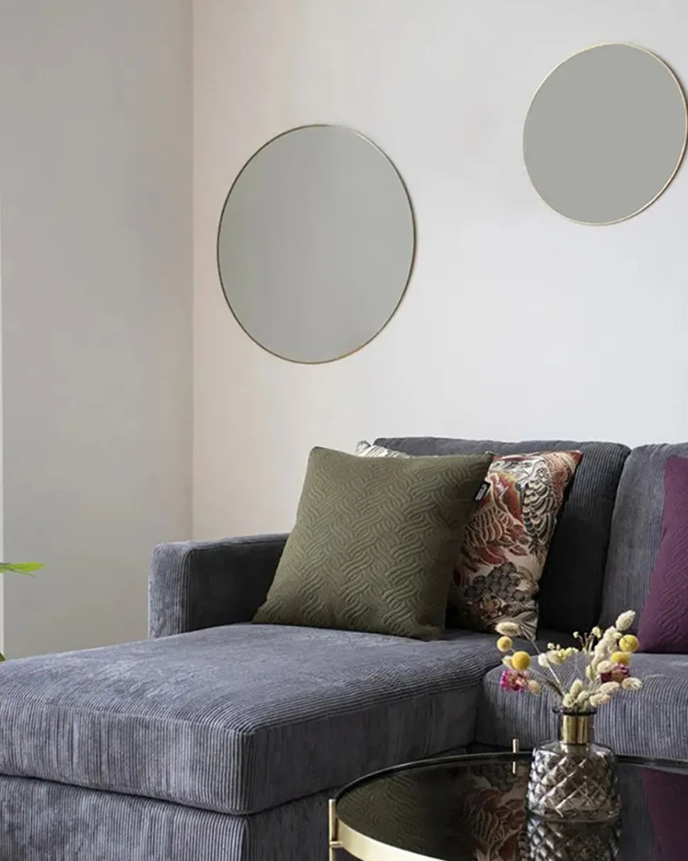 Jessi spejlet i Ø.60 cm er et kompakt og stilrent spejl med en tynd messingramme. Den mindre størrelse gør spejlet ideelt til mindre rum eller som del af en spejlvæg sammen med andre størrelser.