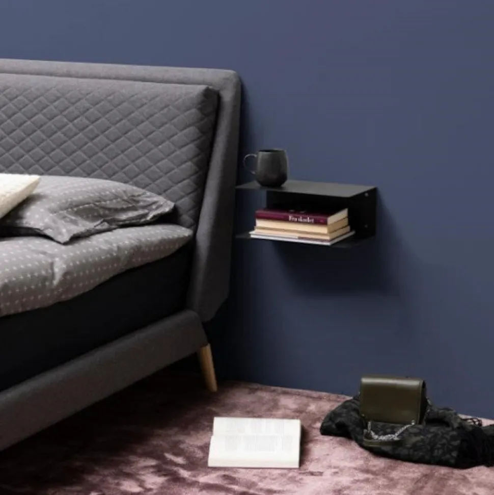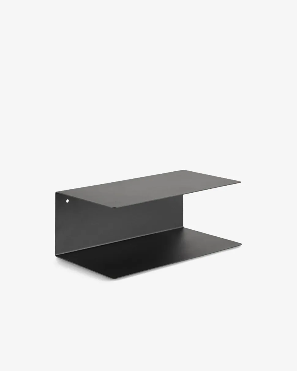 Væghylden er lavet i sortmalet pulverlakeret metal.
