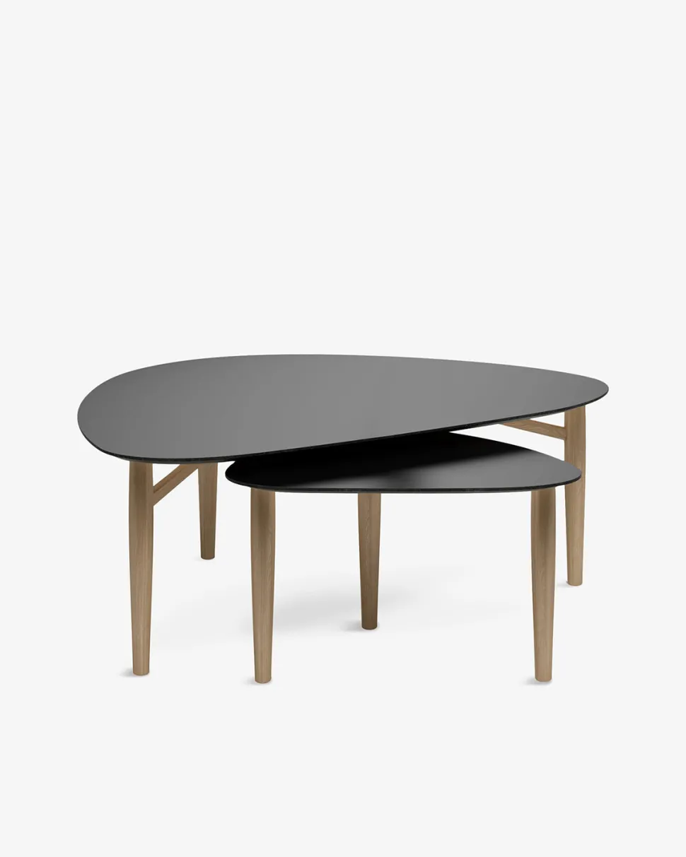 Katrine sofabordssættet består at to borde. Bordpladen er her vist med sort laminat. Bordbenene er i eg/natur. Bordbenene er drejet konisk.Katrine sofabordet er dansk designet og du kan vælge mellem 6 forskellige former, 8 forskellige laminater og 5 forskellige slags ben.