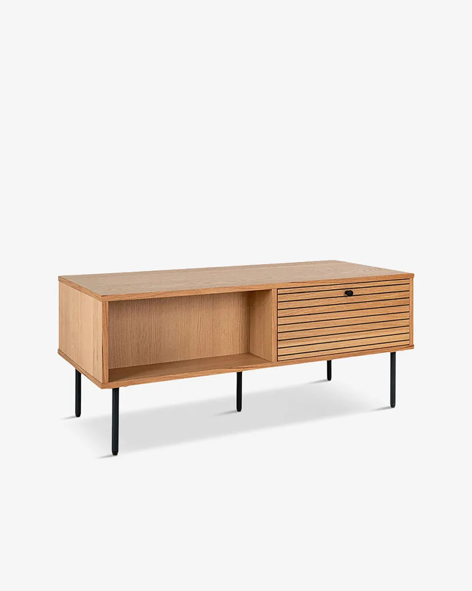 Bordet har en praktisk skuffe, der giver dig mulighed for at opbevare småting som fjernbetjeninger, aviser og andre nødvendigheder, så dit rum forbliver ryddeligt.