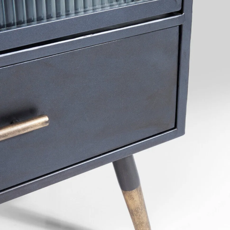 Stilen på vitrineskabet er en smuk kombination af rå metal med et industrielt udtryk, og riflet glas på sider og låger, som giver en antik retro fornemmelse.