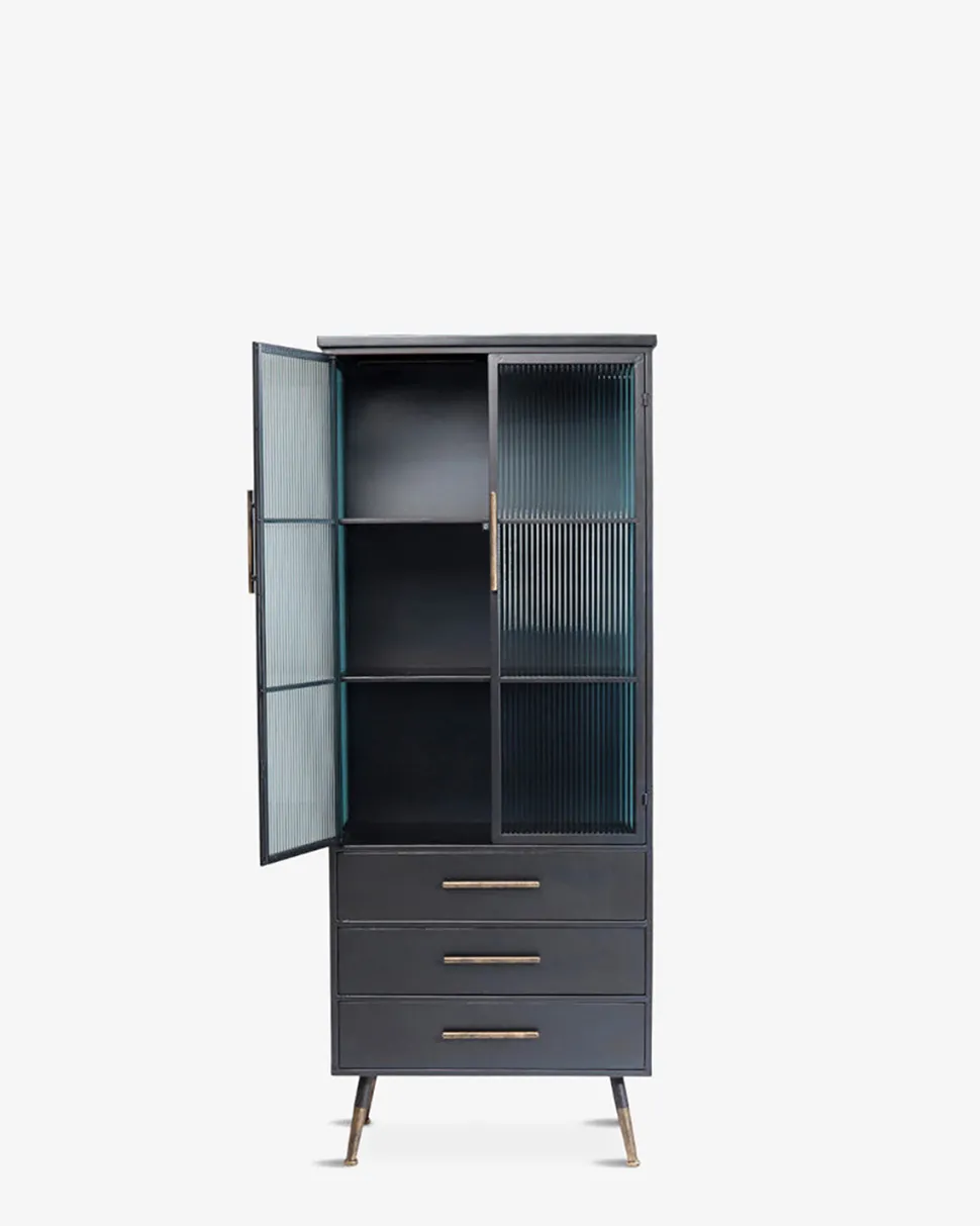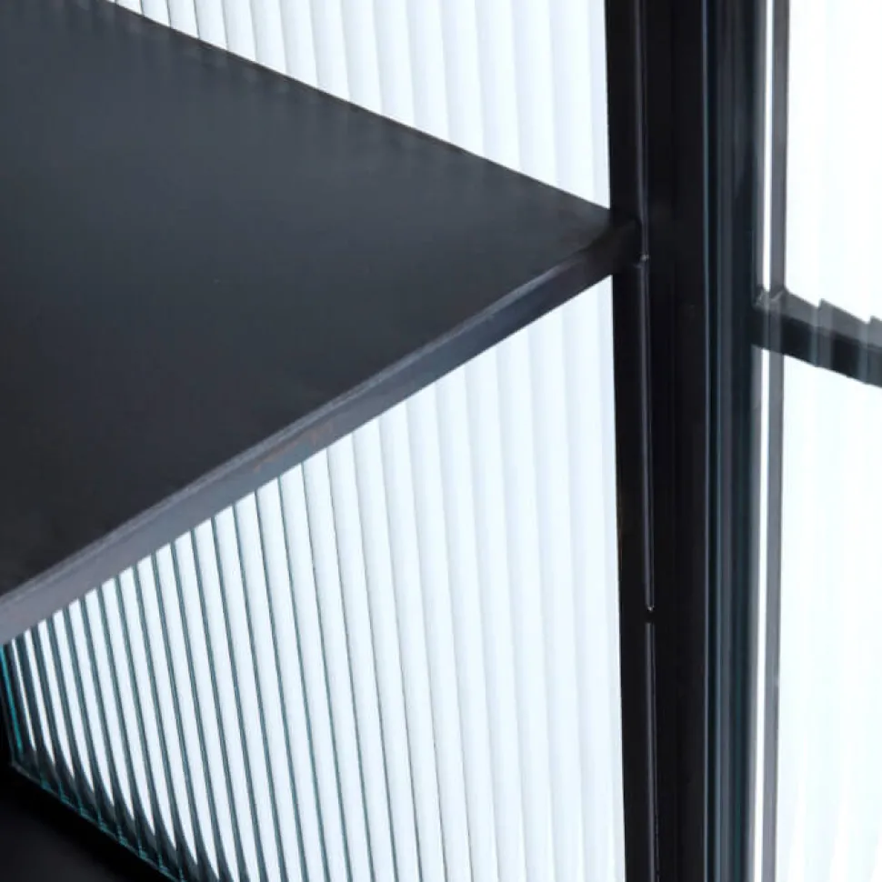Stilen på vitrineskabet er en smuk kombination af rå metal med et industrielt udtryk, og riflet glas på sider og låger, som giver en antik retro fornemmelse.