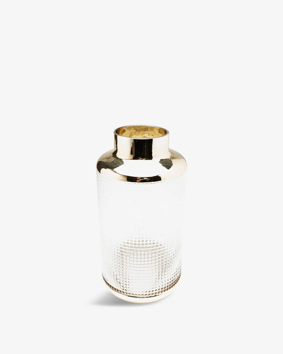 Guldkanten fremhæver enhver buket, og den grafiske prægning af glasset giver vasen et elegant touch.