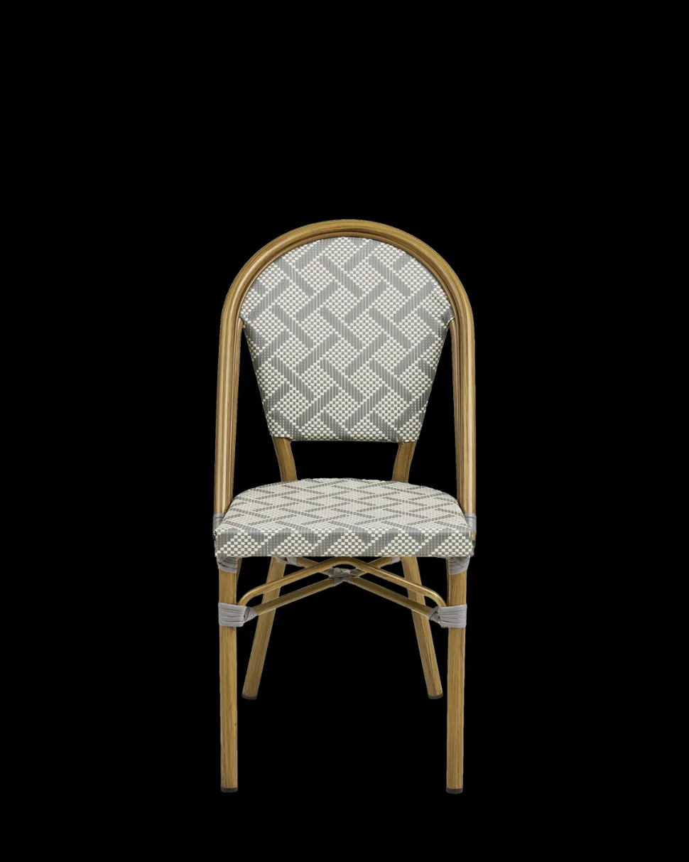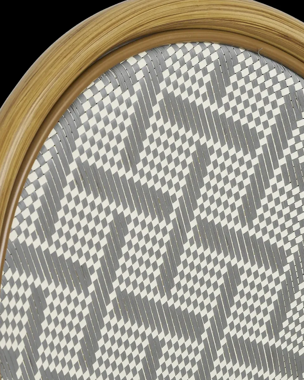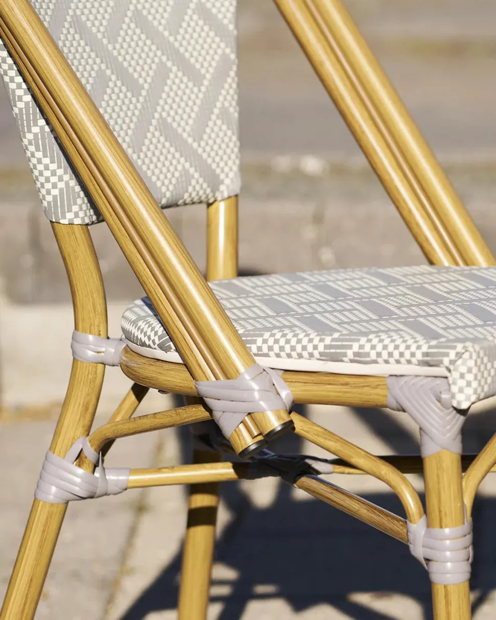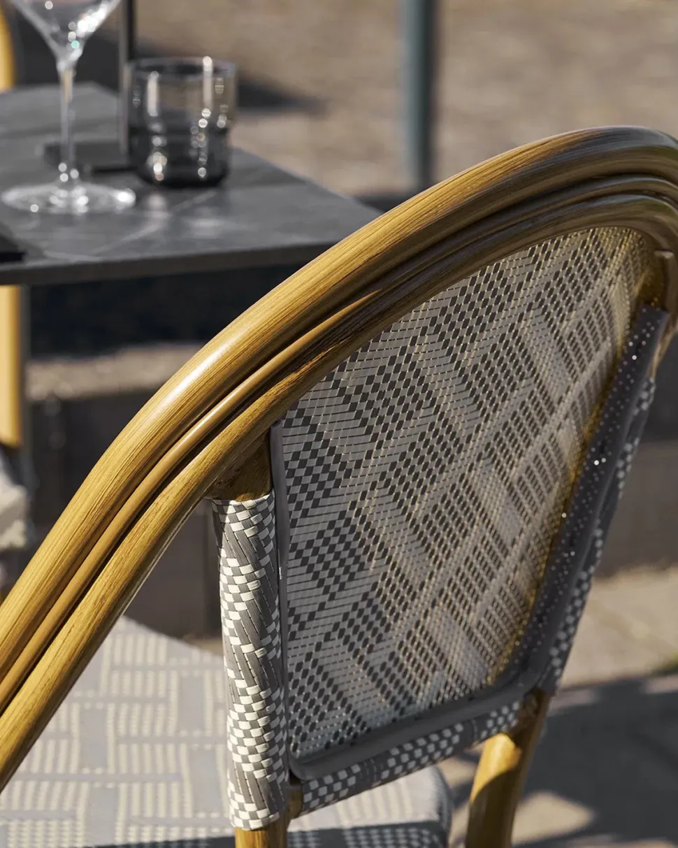 Lauria caféstol i fransk stil med bambuslook stel og gråt polyflet. Vedligeholdelsesfri og perfekt til udelivet.