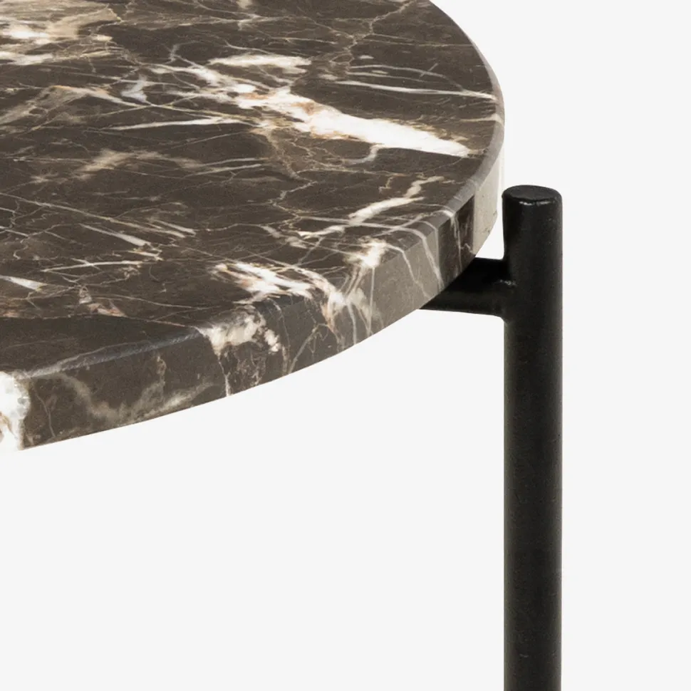 Light sidebordet i brun marmor tilfører varme og eksklusivitet til indretningen. Den runde bordplade i brun marmor med naturligt farvespil giver et elegant og levende udtryk, mens det sorte metalstel skaber en moderne kontrast.