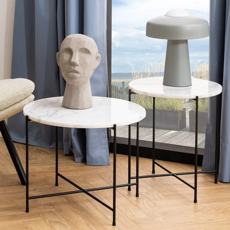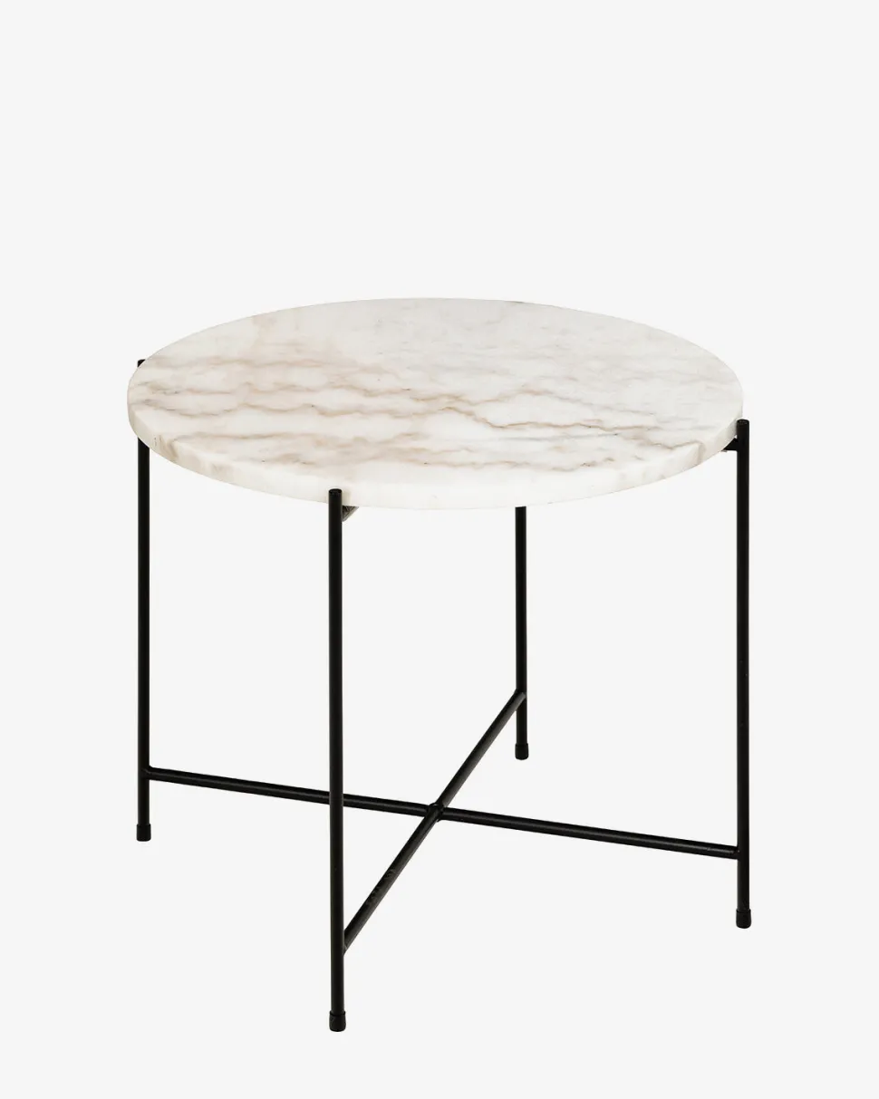 Light sofabordet med hvid marmorplade giver et lyst og tidløst udtryk. Den runde plade i hvid marmor med fine, naturlige årer giver klassisk elegance, mens stellet i sort metal tilfører et moderne modspil.
