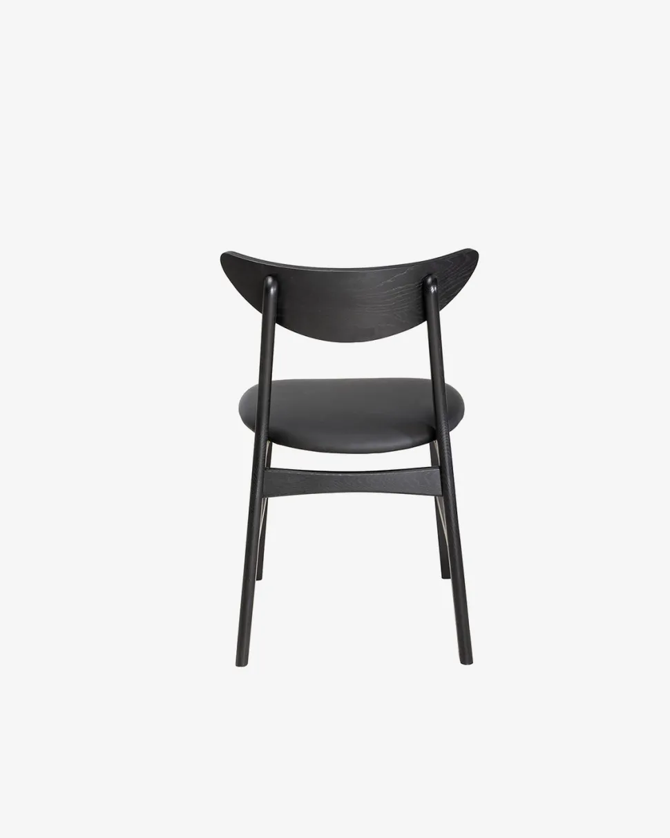 Liva spisebordsstolen kombinerer et let og tidløst udtryk med god siddekomfort. Stolen har et sort træstel og et polstret sæde betrukket med sort læder, som giver en behagelig og praktisk siddeflade til hverdagsbrug.