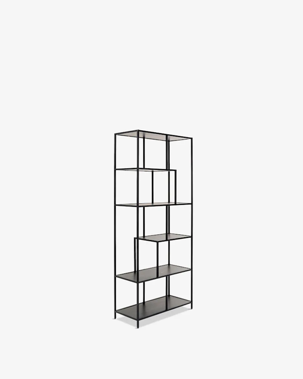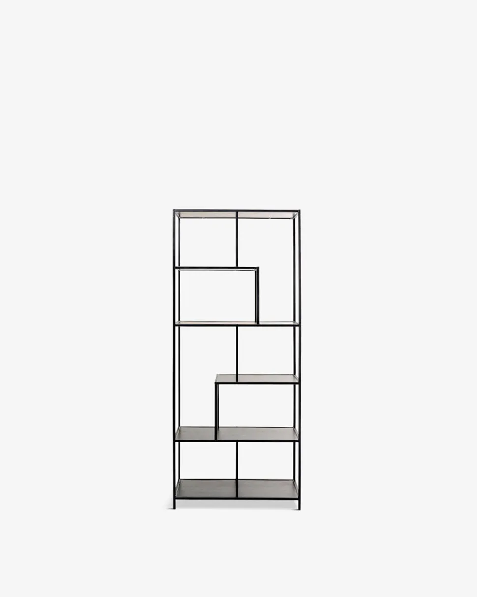 Stor, sort metalhylde i elegant loft-stil. Hylderne med mørk egetræsfiner giver reolen et særligt varmt præg.