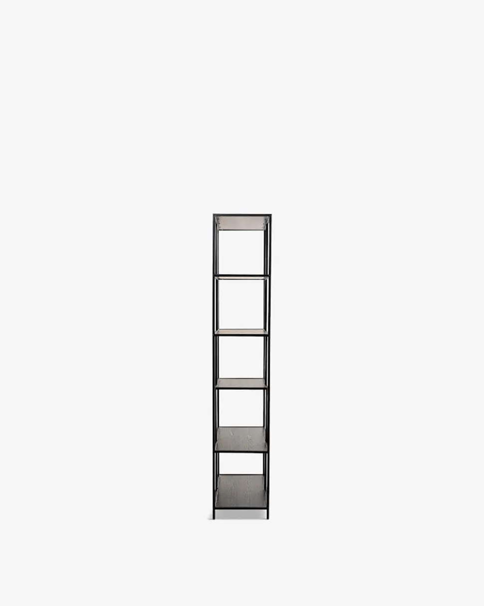 Hylderne med mørk egefinér giver reolen en særlig elegance.
