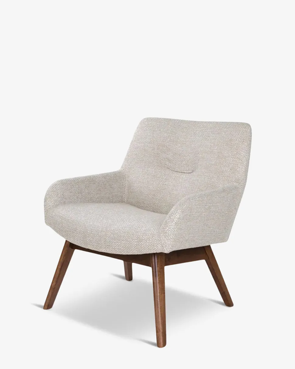 En loungestol i sandfarvet stof med valnødfarvede træben vil være et stilfuldt og moderne valg.