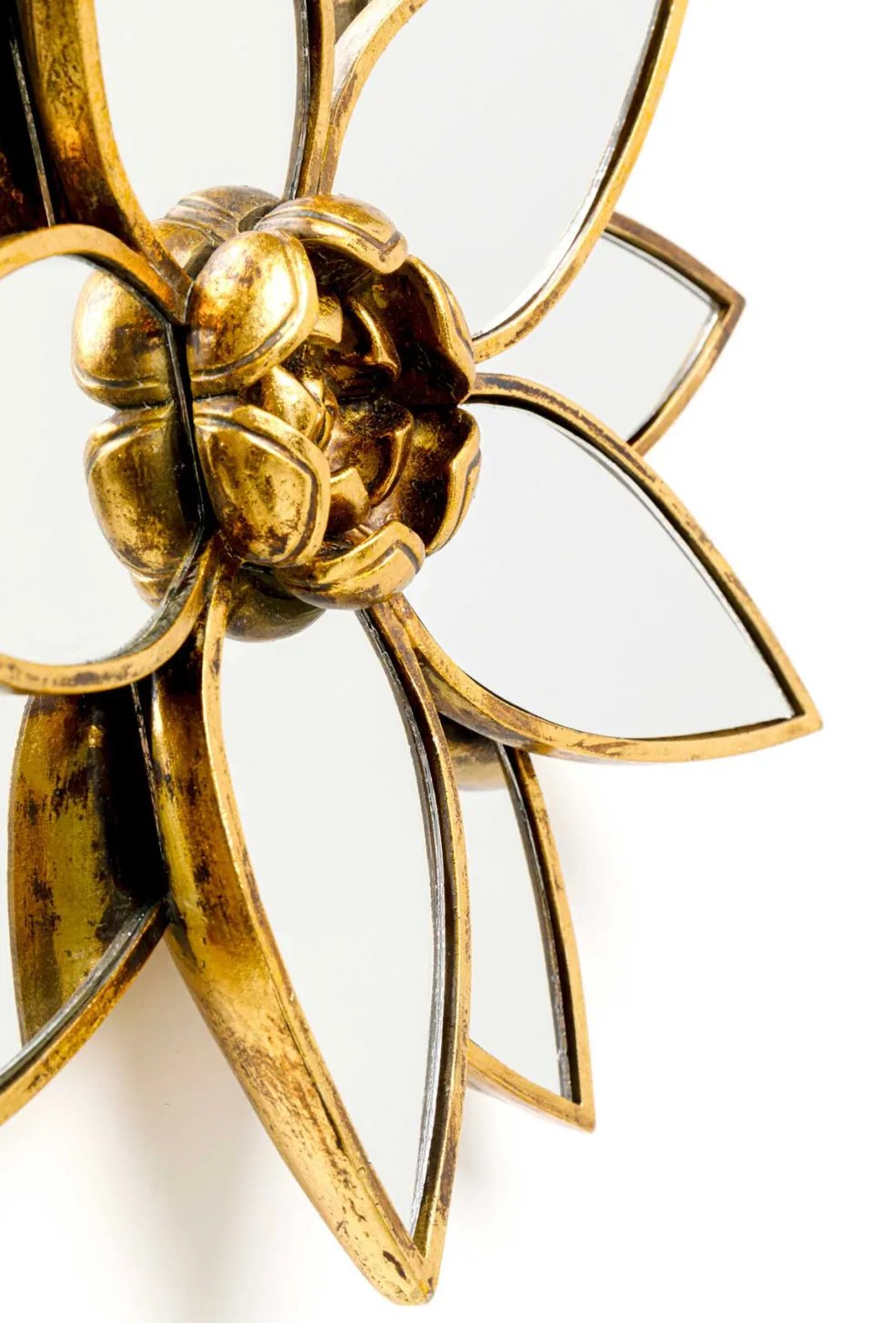 Lotus Vægspejl – dekorativt design med gylden glød. Lotus vægspejlet er formet som en lotusblomst og skaber et elegant blikfang.