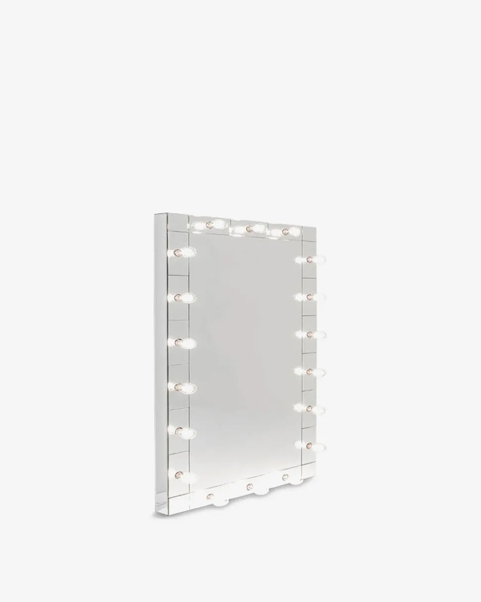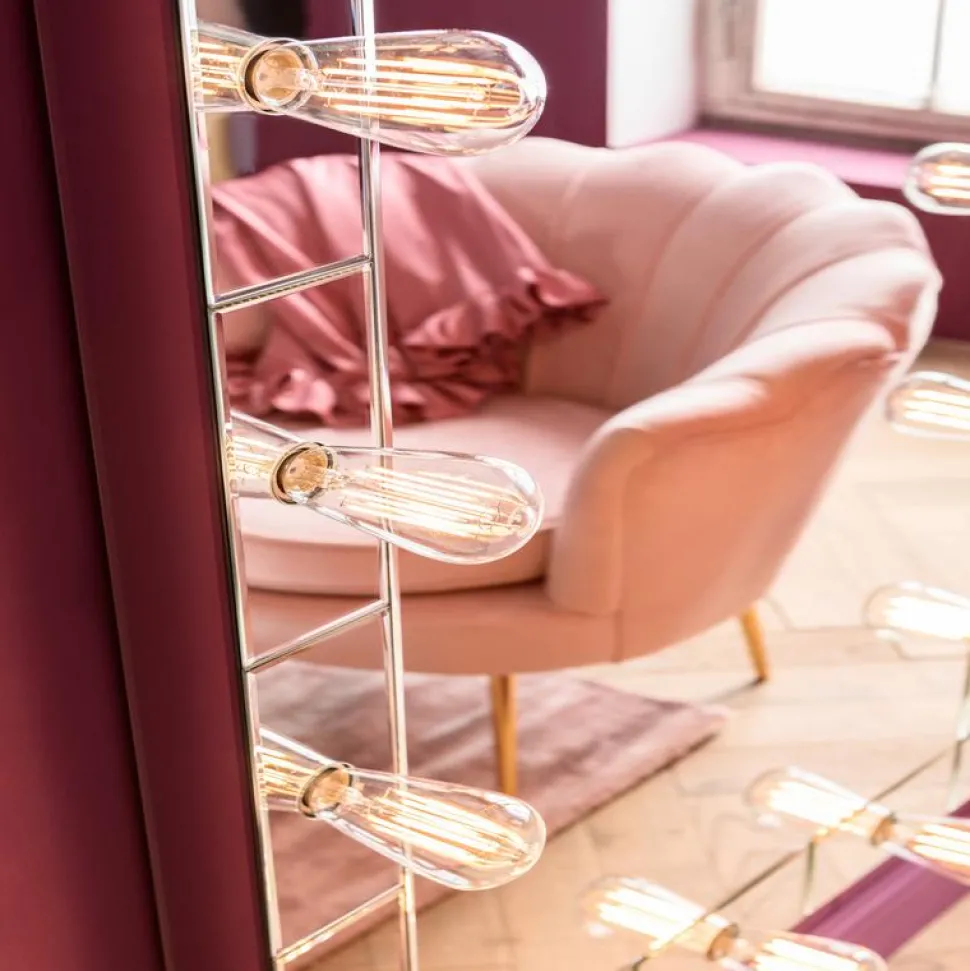 Dekorativt og stilfuldt aflangt gulvspejl, hvor der er plads til 18 pærer langs kanten (Hollywood-stil).
