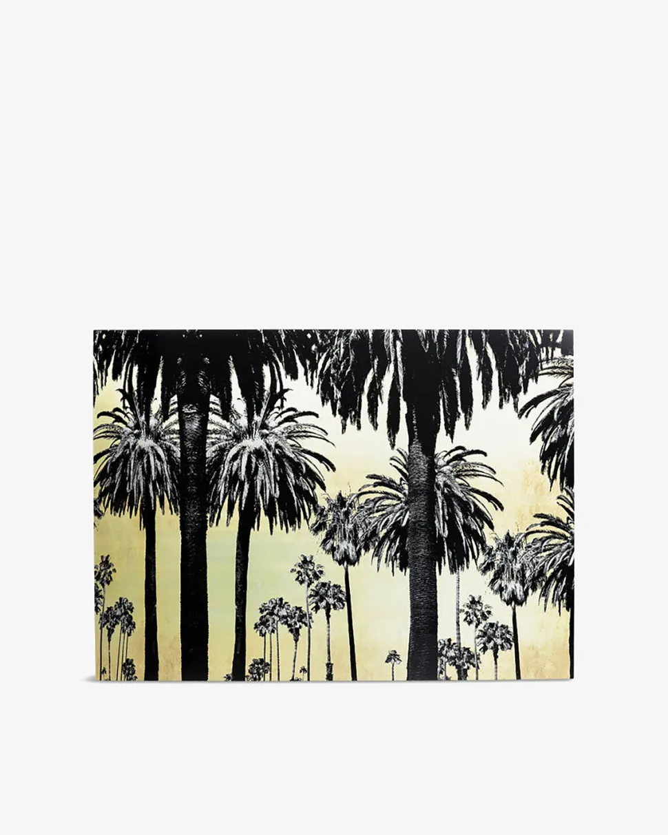 Er du på udkig efter lidt anderledes vægkunst, så tjek lige dette glasbillede med palmer og gul himmel mellem palmerne.