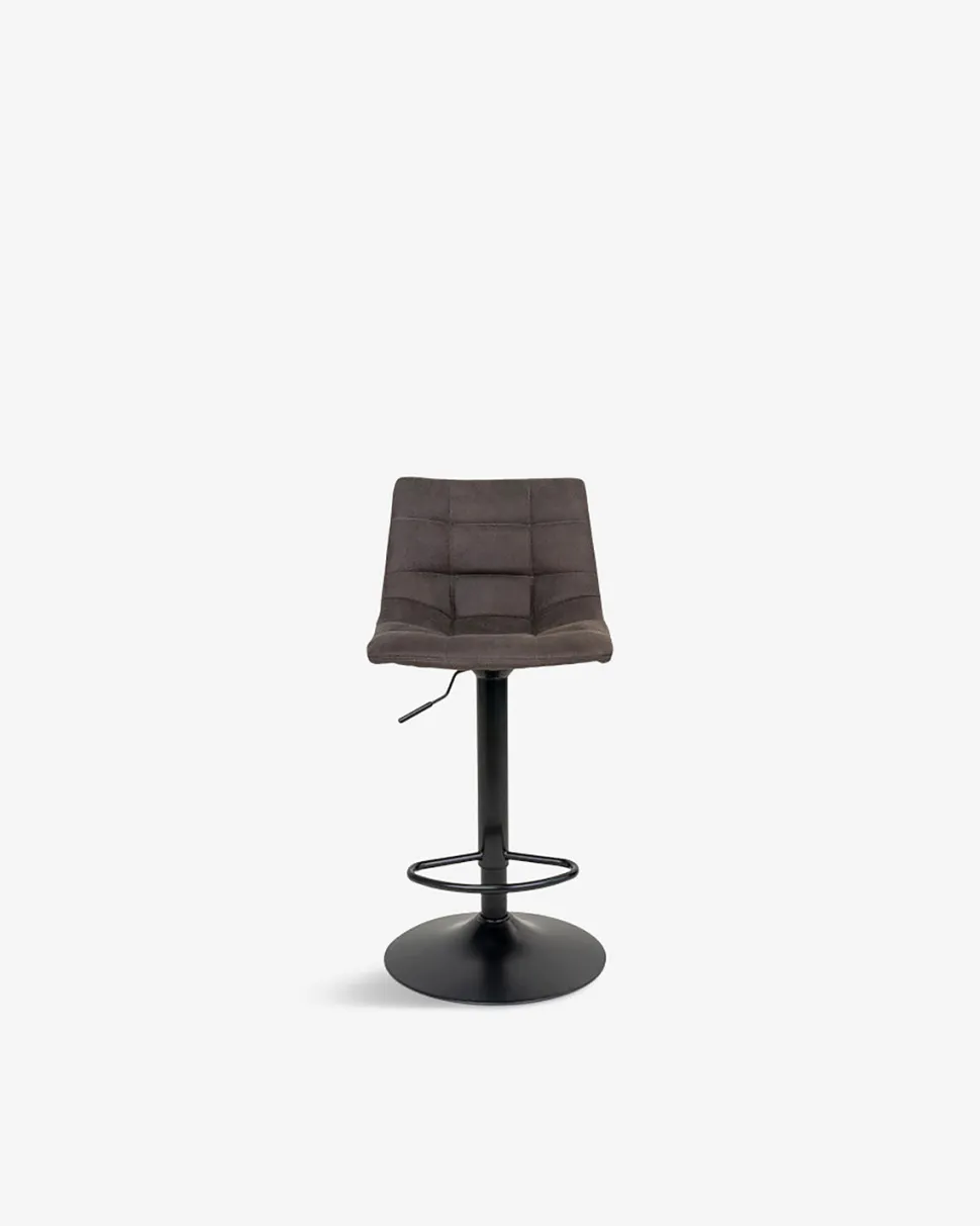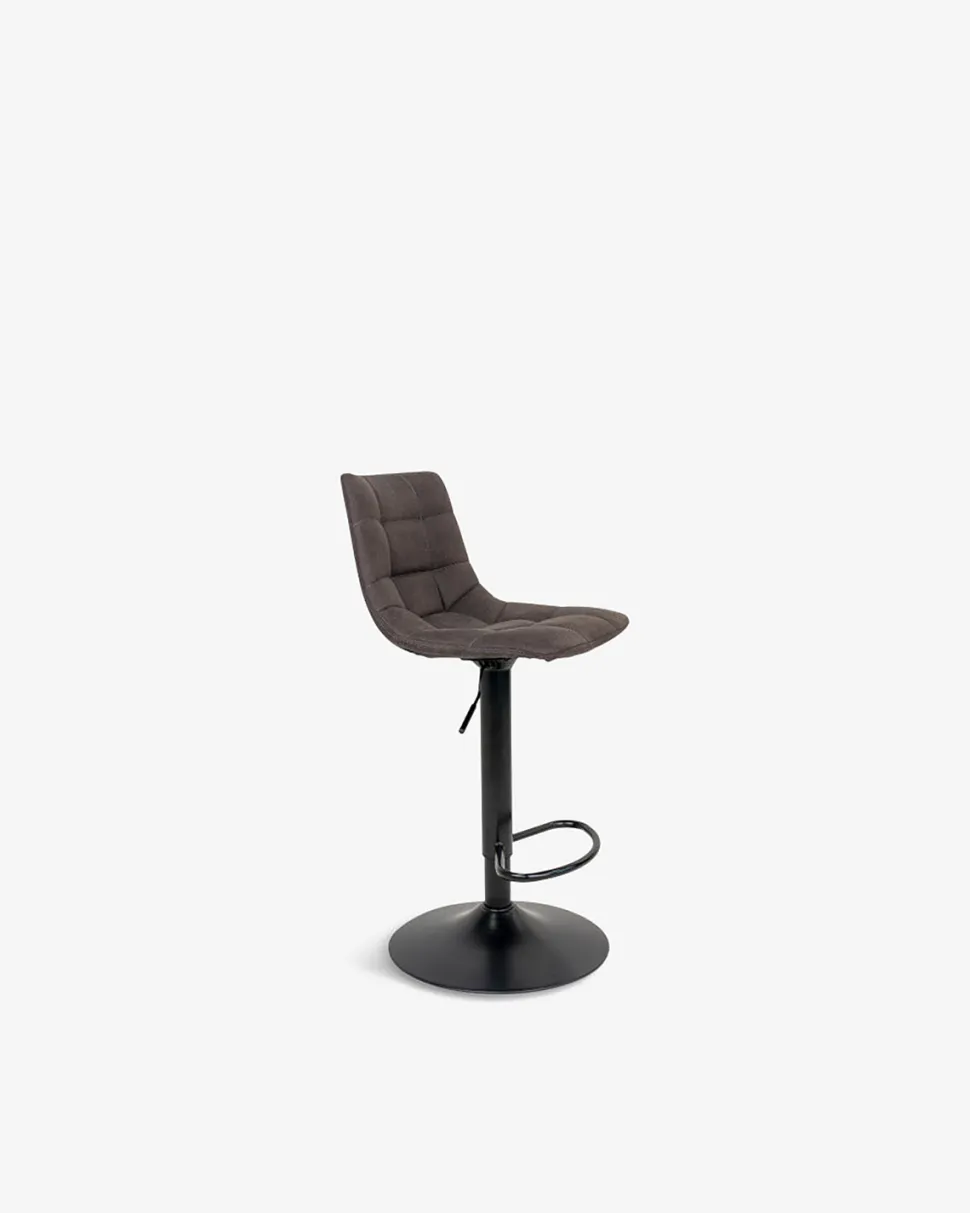 Barstolen er polstret med mørkebrun mikrofiber, og dens mørke nuance passer godt ind i mange indretninger, hvad enten det er køkken, spiseområde eller bar.