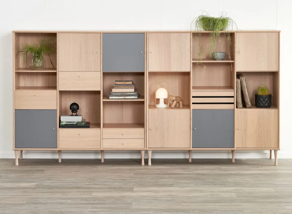 Stor rummelig reol med mange gode rum til opbevaring og visning af ens ynglings pynt. Reolen består af 2 høje skænke i hvidpigmenteret eg, monteret med låger og skuffer i eg og lys grå lak. Opstillingen består af 2x 119-15/ 8x 078-15/ 3x 073-15/ 2x 071-15/ 1x 172-15/ 5x 126-15/ 3x 126-