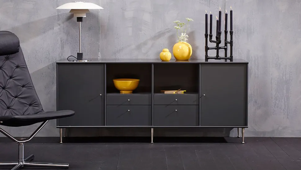 Klassisk Mistral skænk i antrasitgrå, med børstede stål ben. Mistral skænken kan sammensættes i et utal af kombinationer og farver.