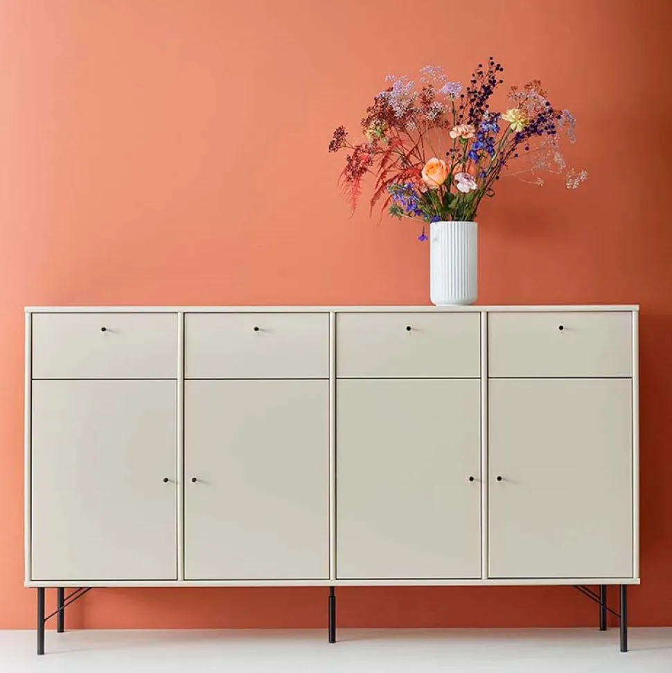 Denne skænk er produceret i lys grå lak, og giver med sine 4 skuffer og 4 låger rig mulighed for praktisk opbevaring i stuen eller på kontoret.