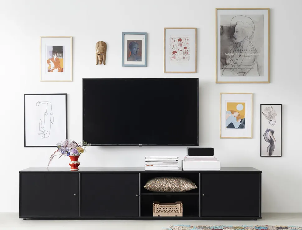 Bredt TV-bord i den moderne Mistral serie udført i sortbejdset egetræ. I møblet er der 4 rum hvor 3 af dem er med låger for. 1 af lågerne er i sort stof så fjernbetjeningen kan skyde igennem. alle rummene er forbundet til kabelgennemgang samt i top og bund. Møblet er sat helt tæt til gulvet på stilleskruer. Opstillingen består af: 1×233 – 1×262 – 2×260 – 1×177