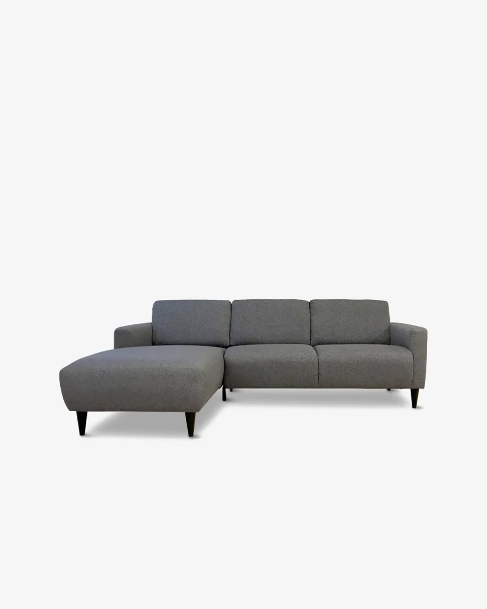 Flot og elegant sofa med chaiselong og en rigtig god sidde komfort. Designet på armlænet er rundt og blødt i formsproget, og kombineret med de flotte sorte ben, giver det en rigtig fin sofa.