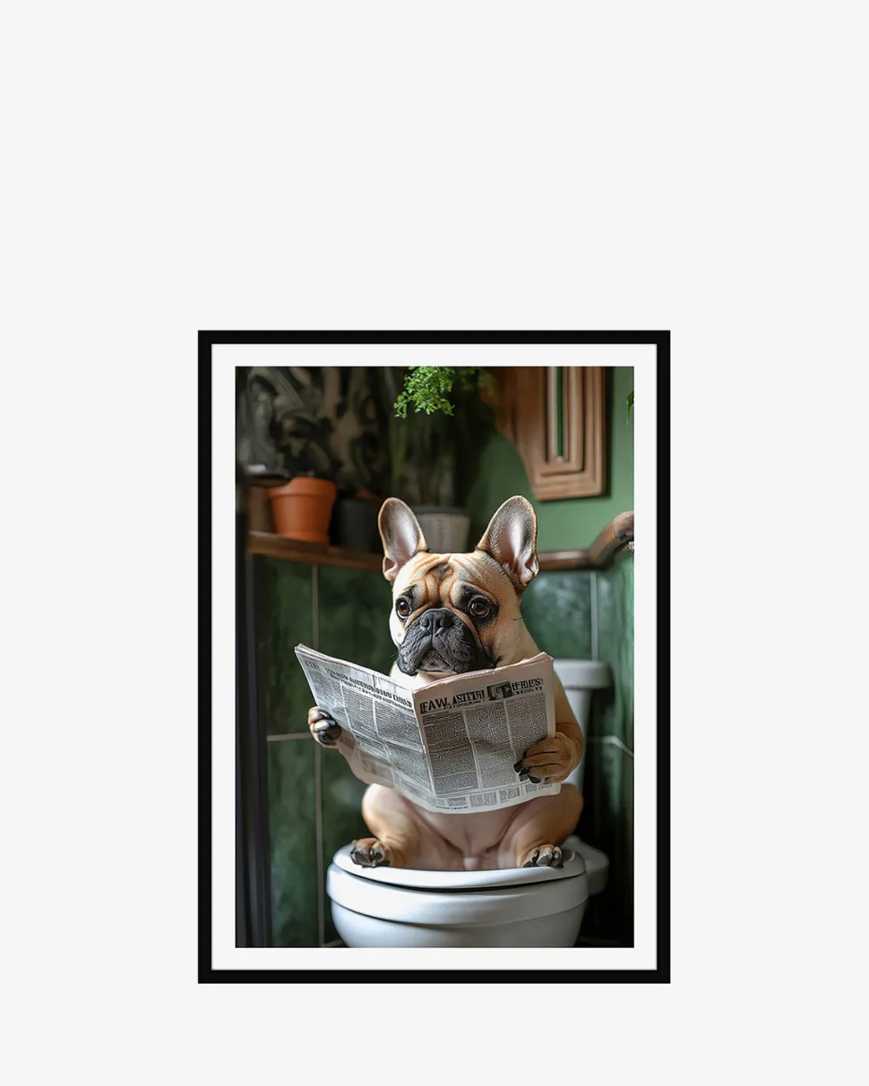 Mopper på toilet er et sjovt billede med en nuttet mops, der sidder afslappet på et toilet, mens den læser avisen og hygger sig i fred og ro.