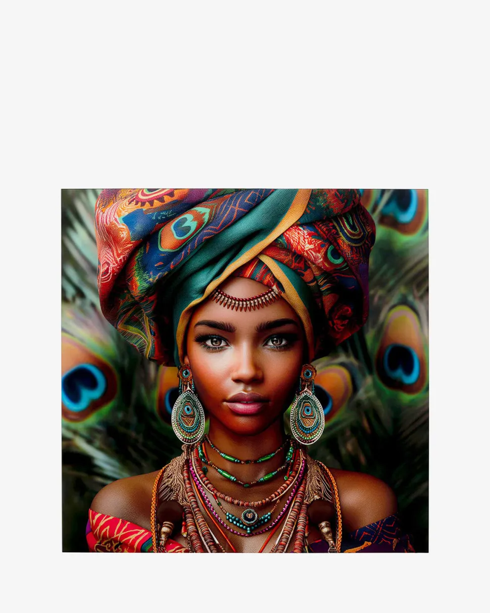 +Farverigt motiv: Afrikansk kvinde med baggrund af påfuglefjer