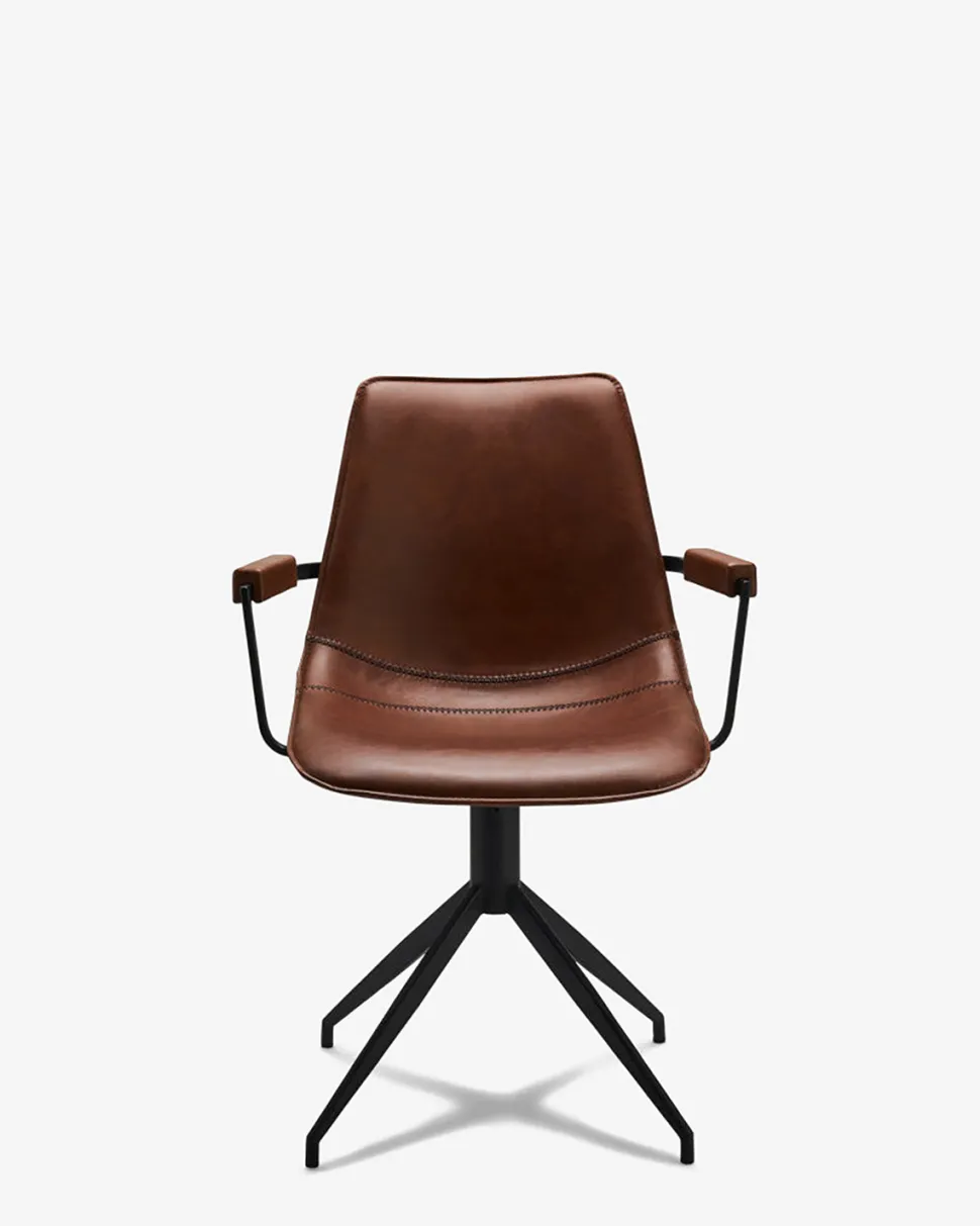 Flot og elegant spisebordsstol i cognac farvet læderlook. Stolen har armlæn så du sidder behageligt, og den er monteret med sorte metal ben.