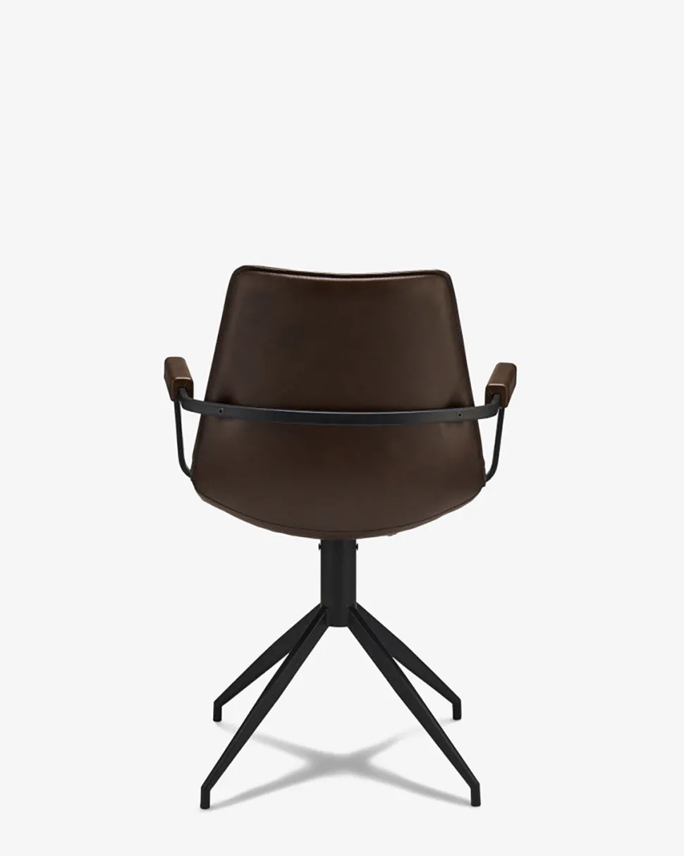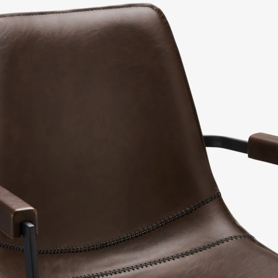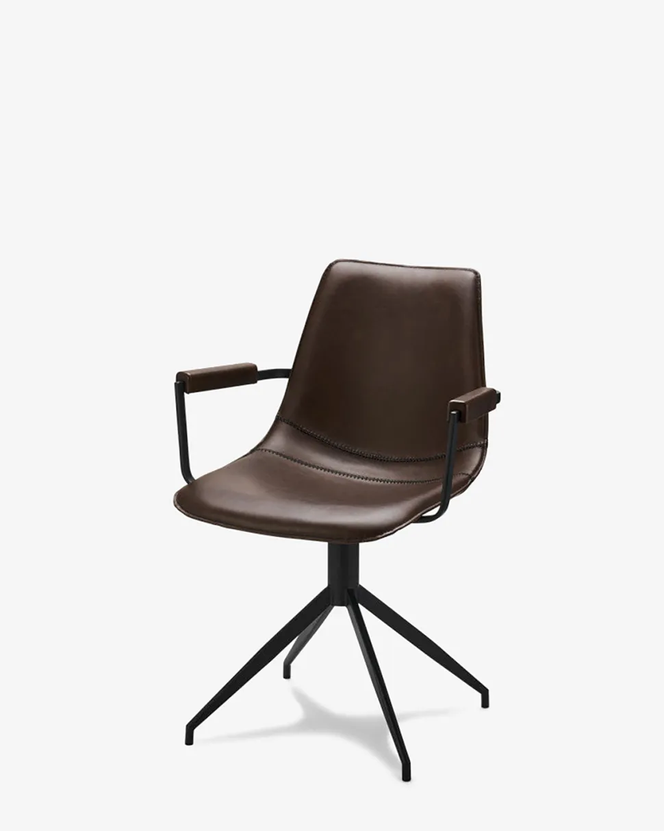 Flot og elegant spisebordsstol i mørkebrun læderlook. Stolen har armlæn så du sidder behageligt, og den er monteret med sorte metal ben.