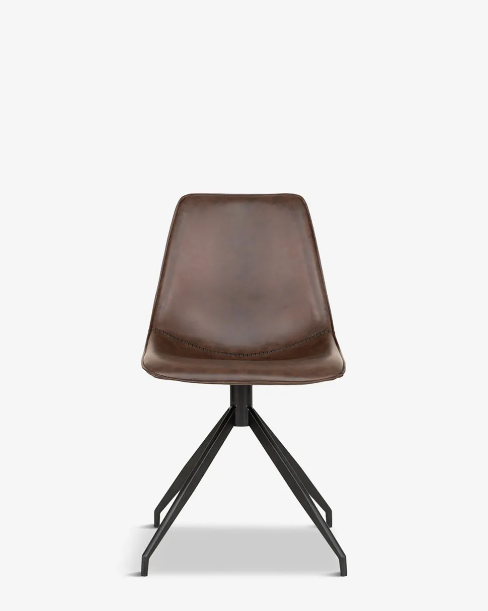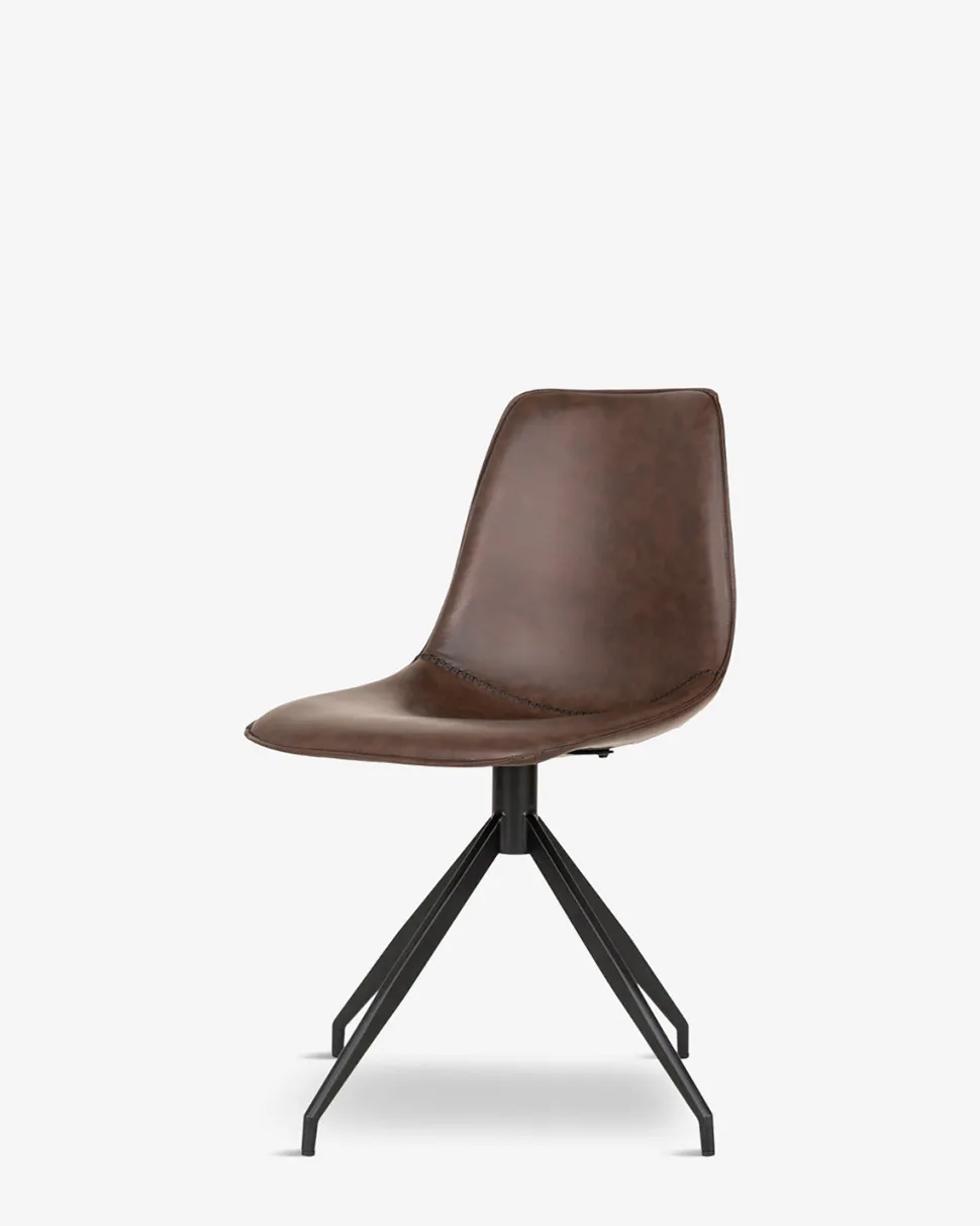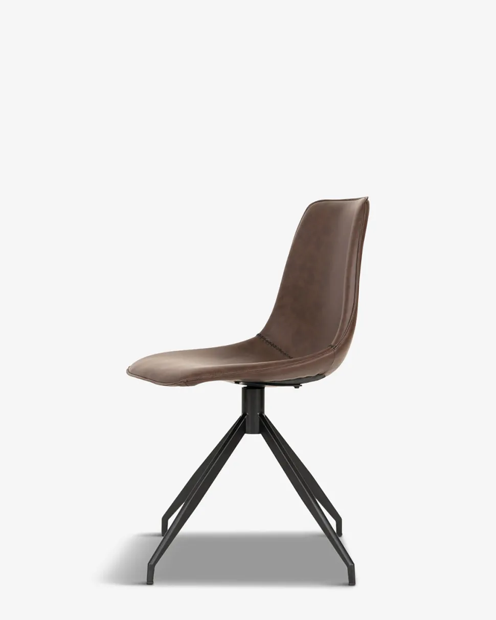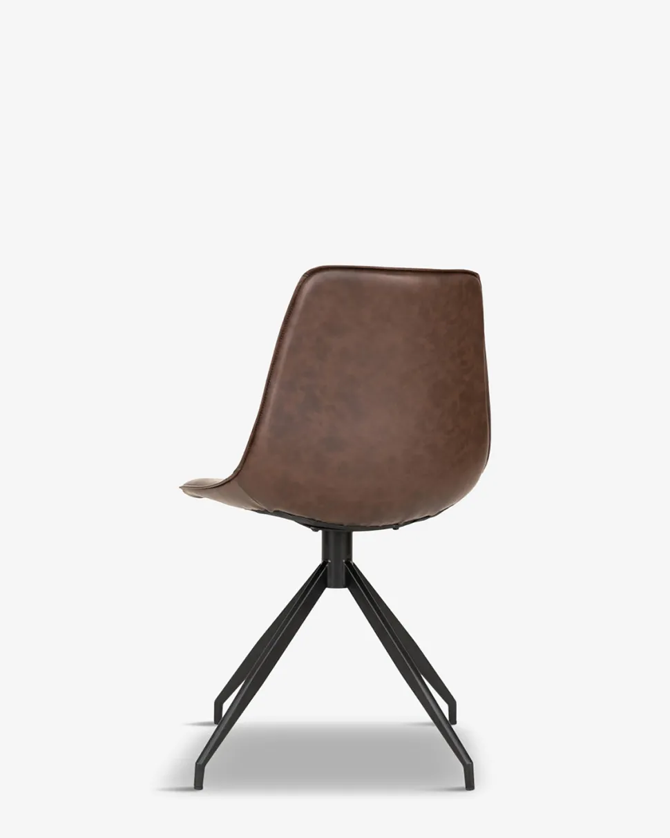 Flot og Enkel Spisebordsstol i mørkebrunt læderlook, monteret med sorte metalben og et smart drejestel.