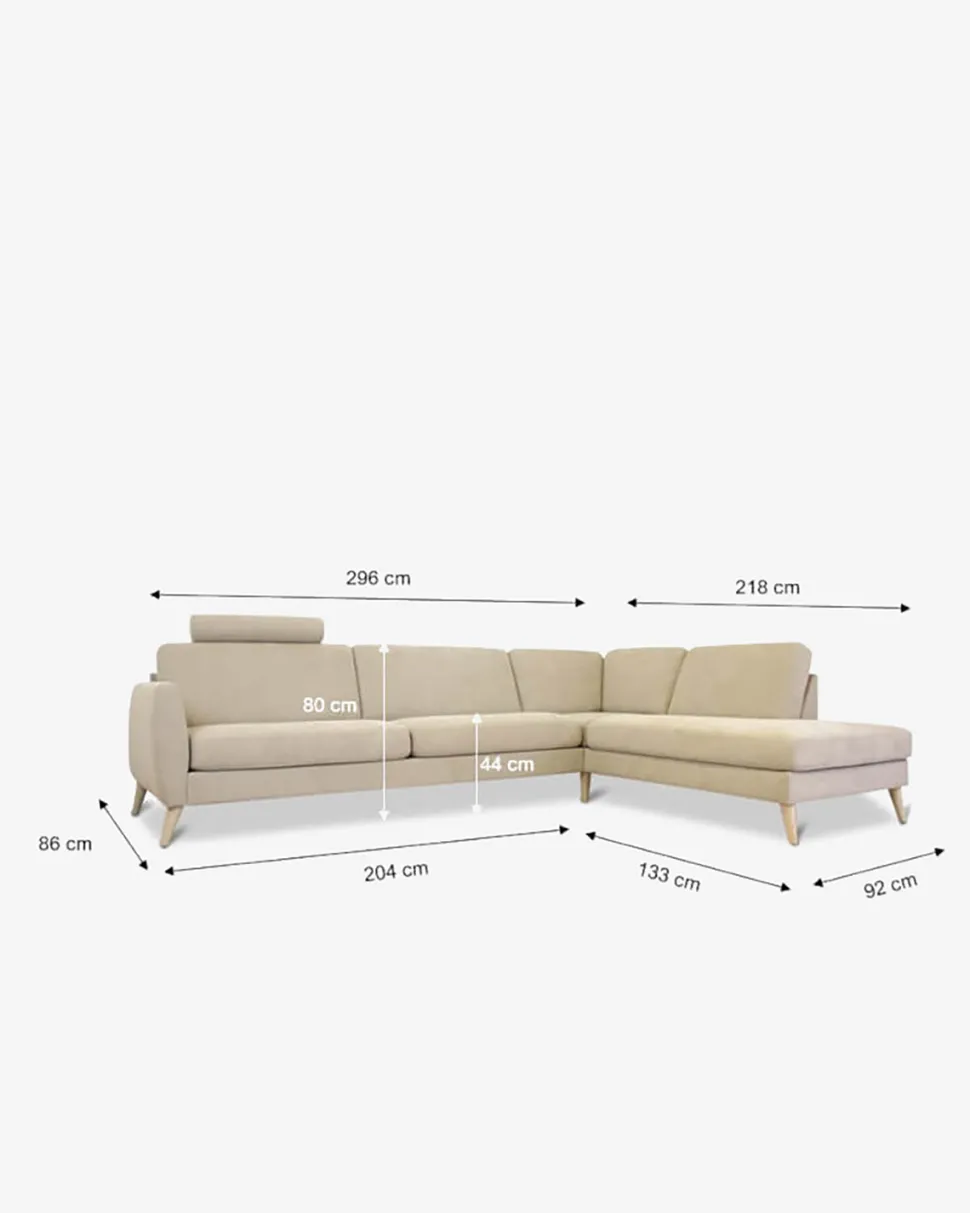 Nova modular er her monteret med Lido beige 4 | Martindale 40.000 | 92% polyesther og 8% nylon | Lysægte 5 | Piing 5. Der er koldskum i sæderne og polyether skum i ryggen. Rygpuderne er vendbar og der kan frit vælges imellem to forskellige armlæn og bentyper uden merpris.