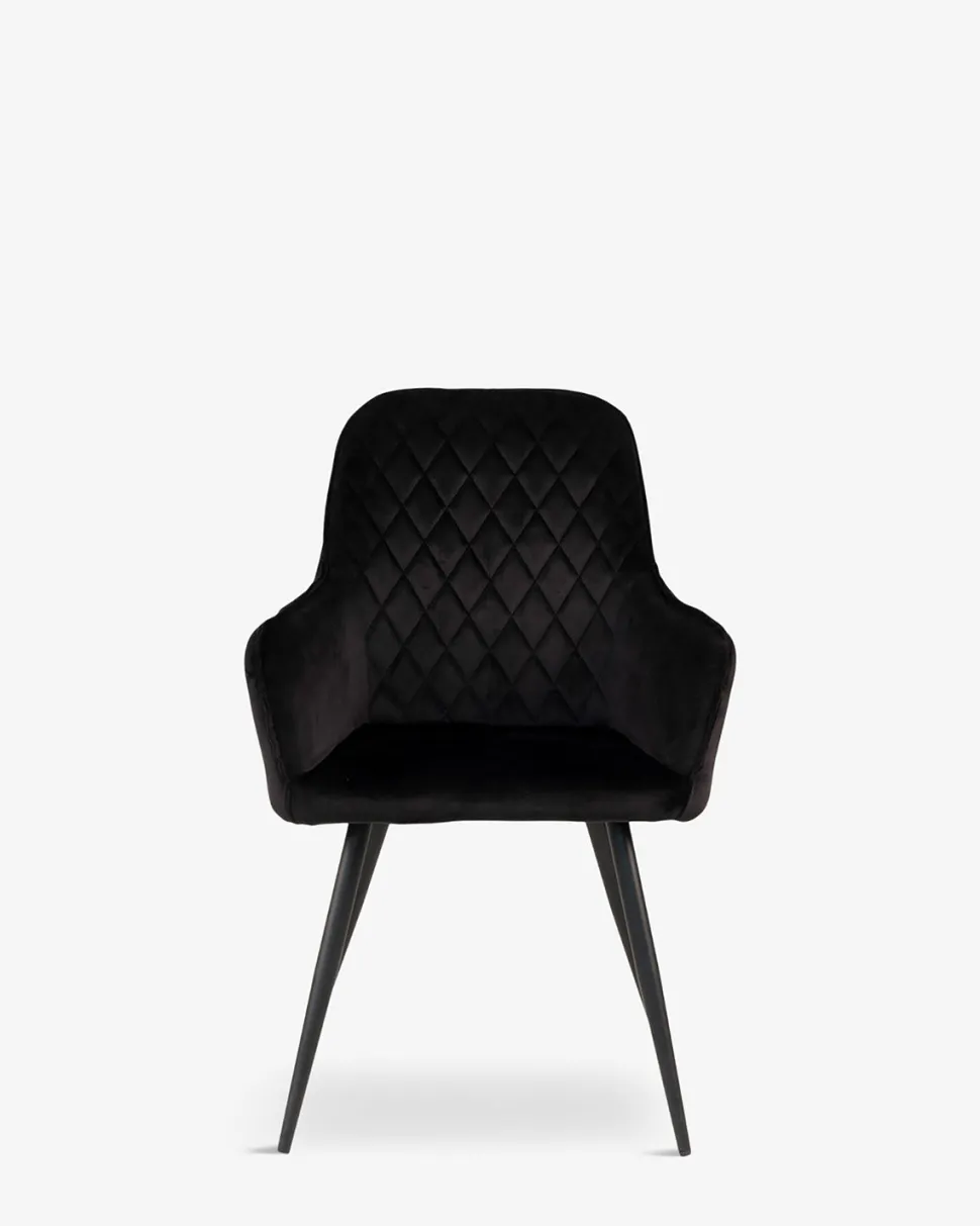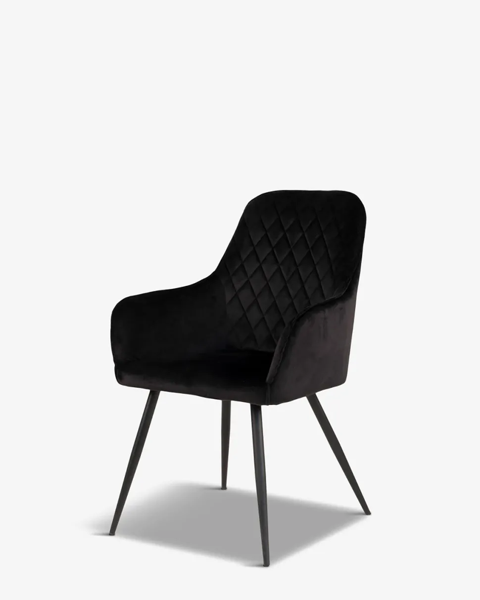 Spisebordsstolen er her betrukket med velour i sort, og den har flotte syninger i ryggen i harlekinmønster, samt stel i sortmalet metal.