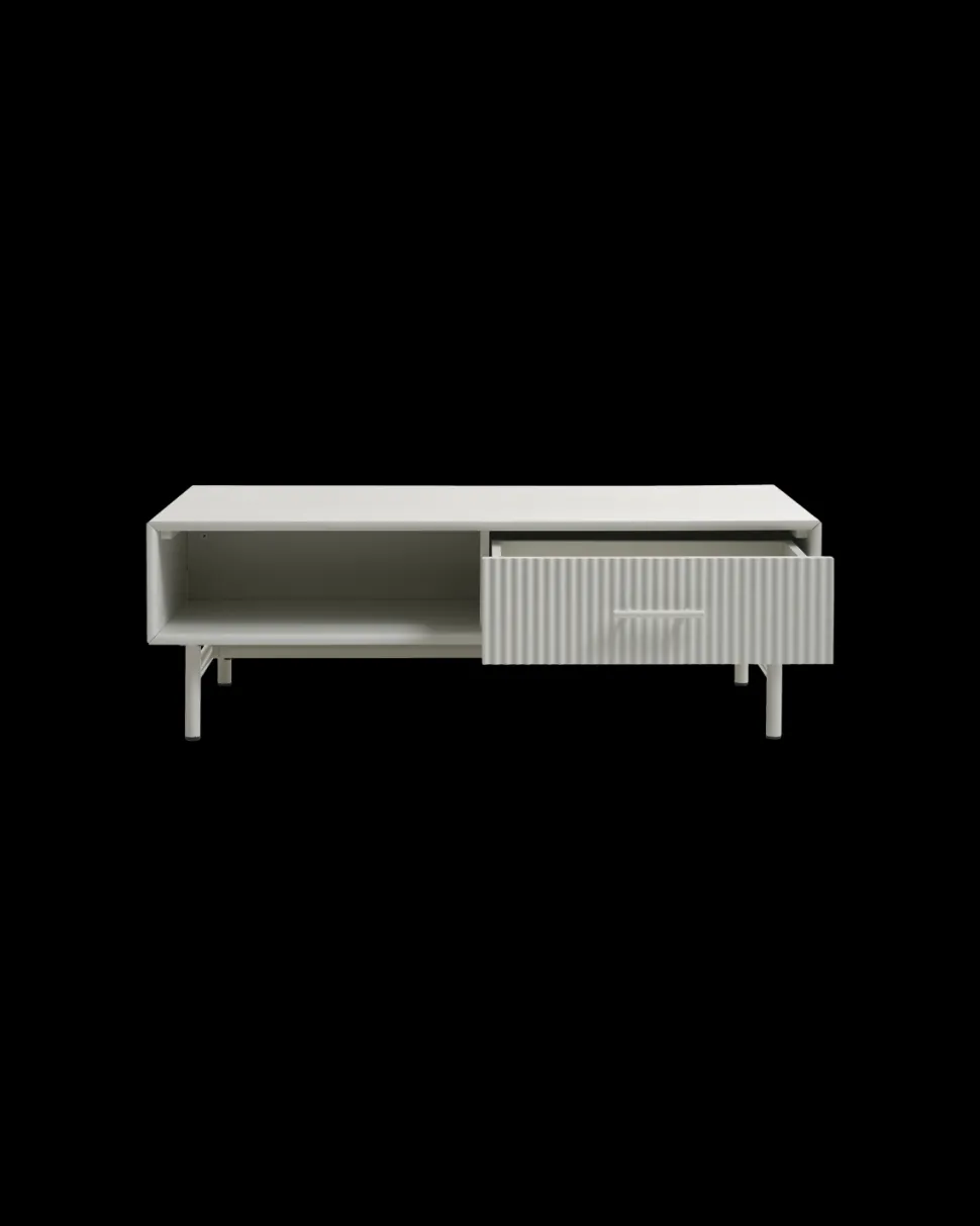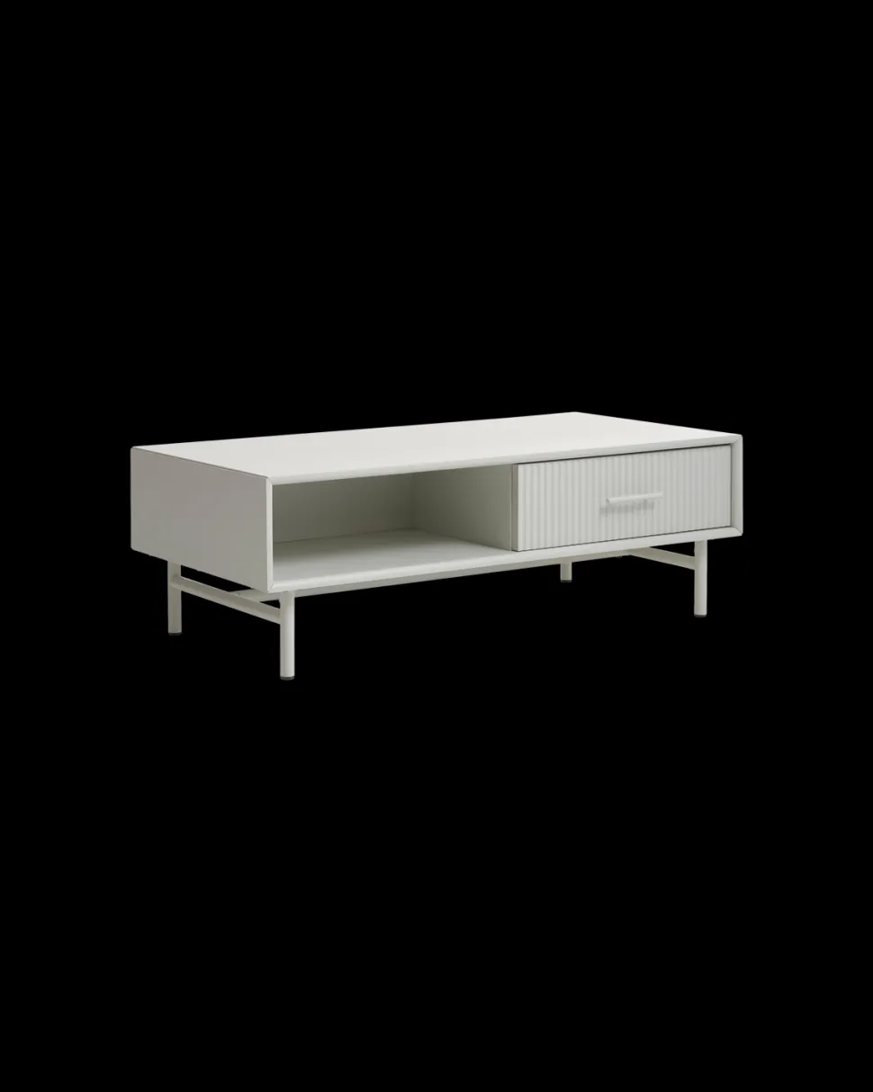Palma sofabord i greige med skuffe og åbent rum. Stilrent design med metalstel og praktisk opbevaring til stuen.