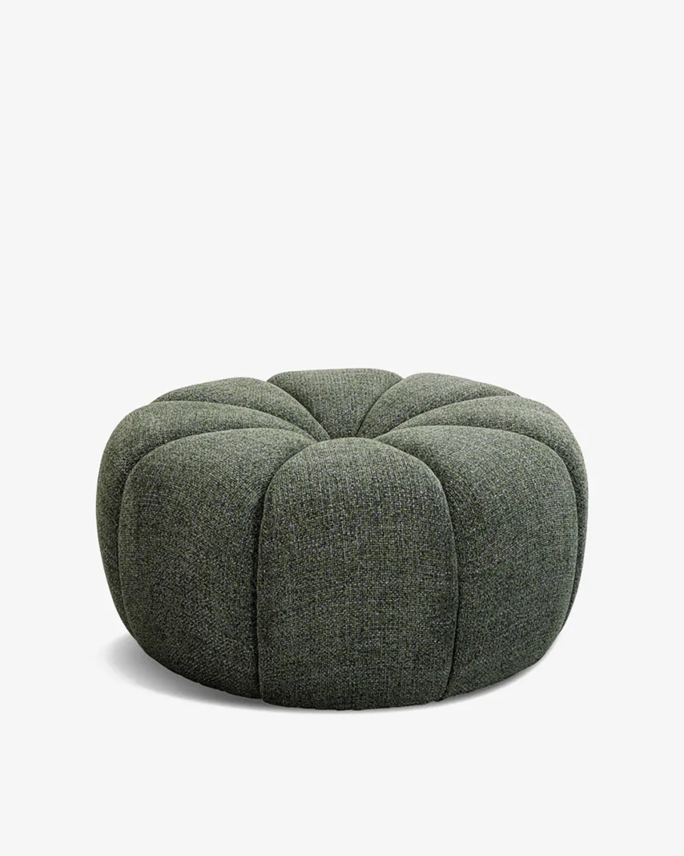 Fin og elegant rund puf fra Peppo med bløde former, og betrukket med dejligt blødt stof i grøn melange.