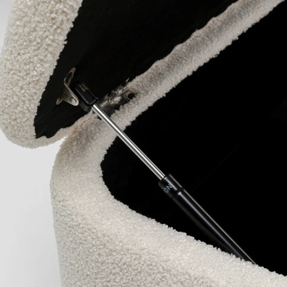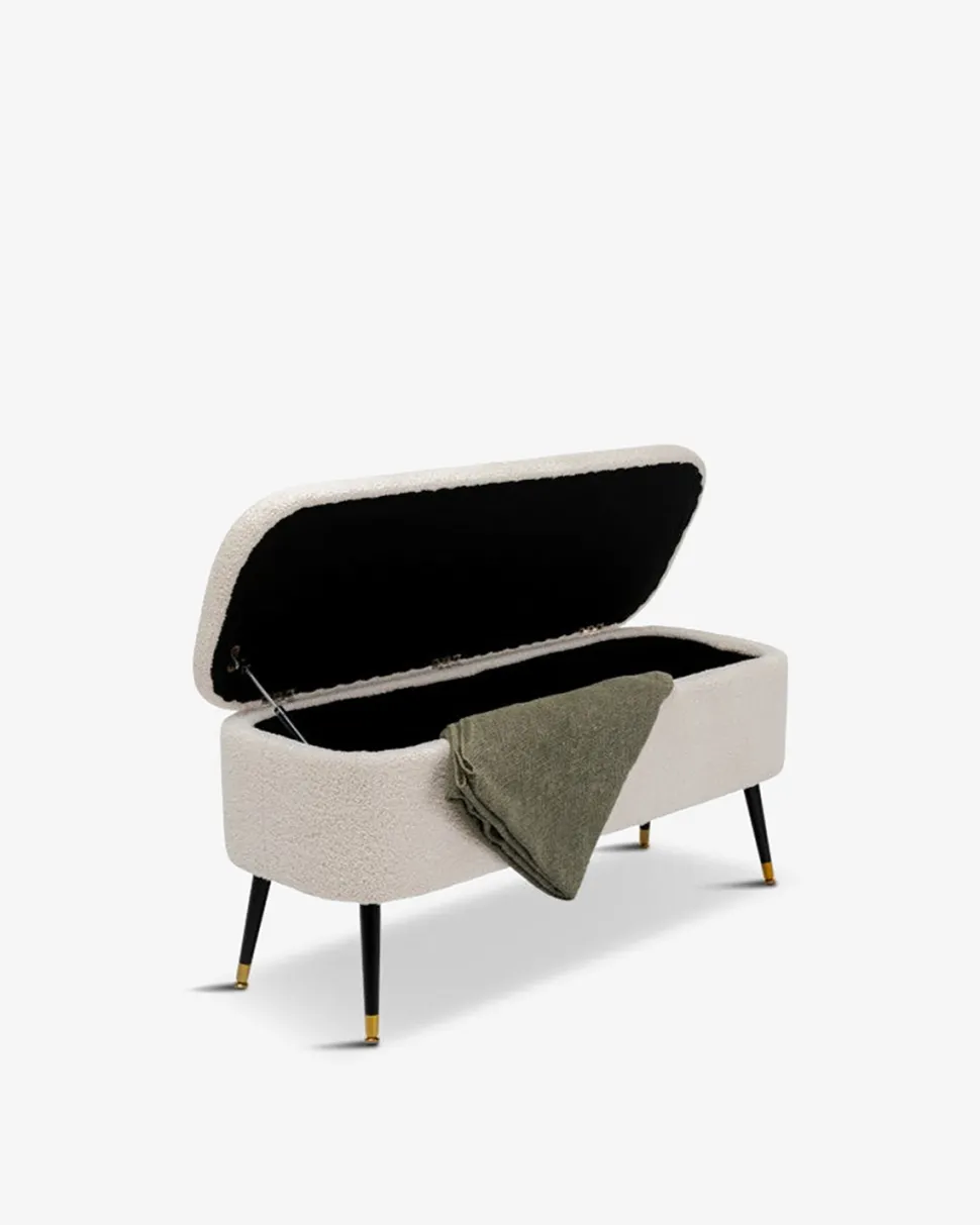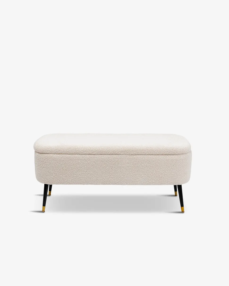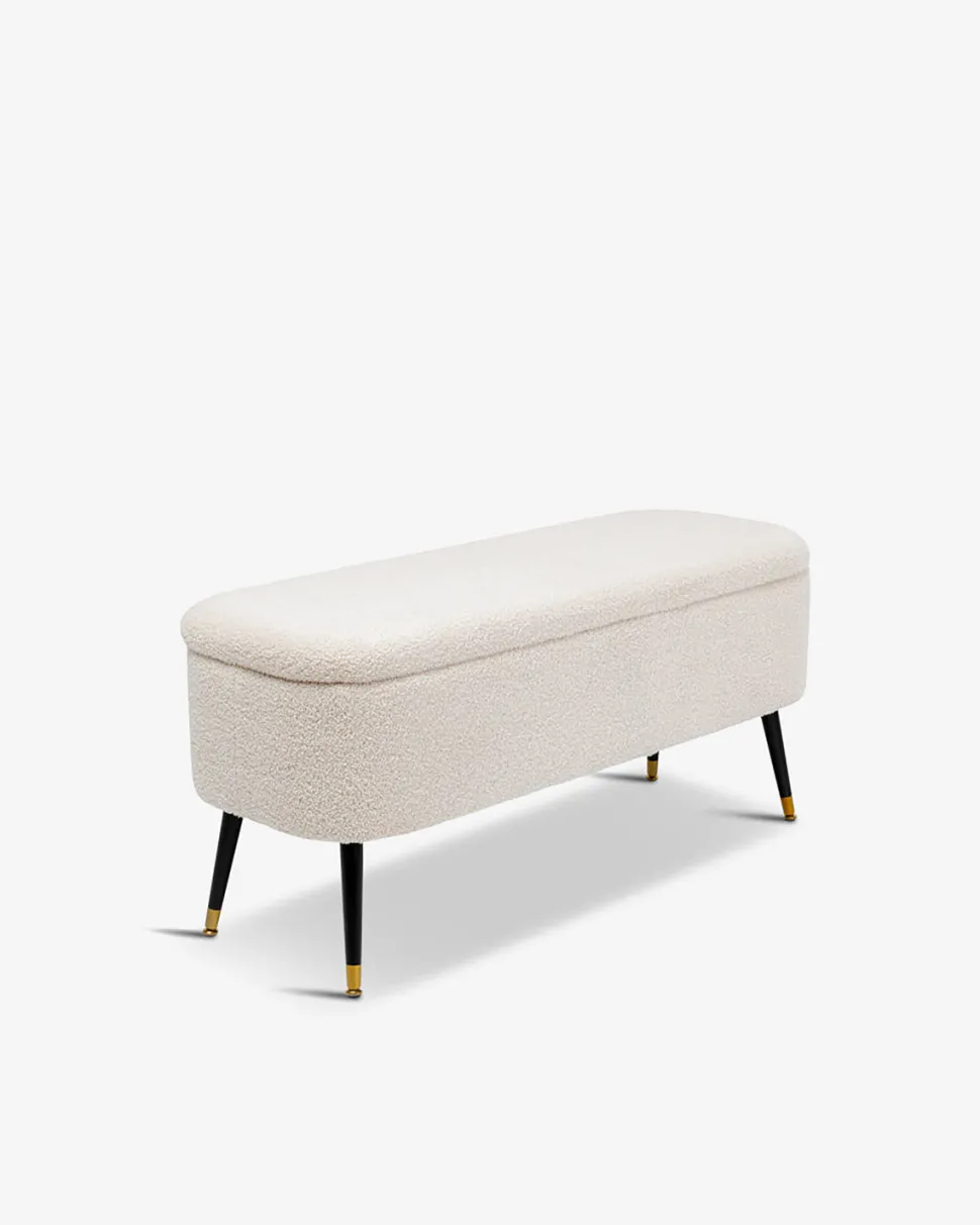 Flot og dekorativ bænk, der kan bruges i entreén, stuen eller i soveværelset. Der er praktisk opbevaringsplads, og den er betrukket med cremefarvet stof i 100% polyester.