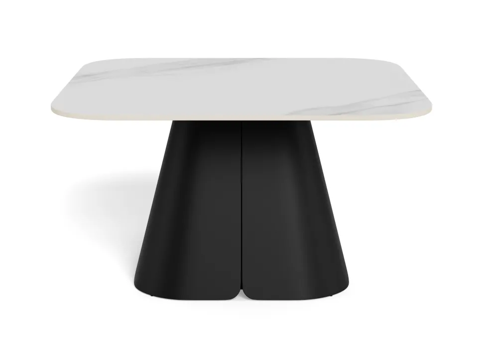 Bordet har en elegant keramisk hvid bordplade, der giver et stilrent og tidløst look. Det bæres af et robust sort stål søjlestel, som skaber en flot kontrast og giver stabilitet.