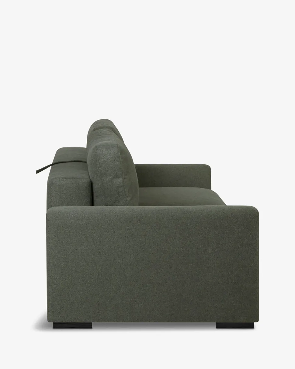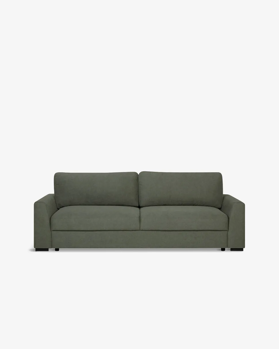 Flot sovesofa i et enkelt og klassisk look med en god liggekomfort. Sofaen er monteret med slidstærkt stof i den meget populære mosgrønne farve.
